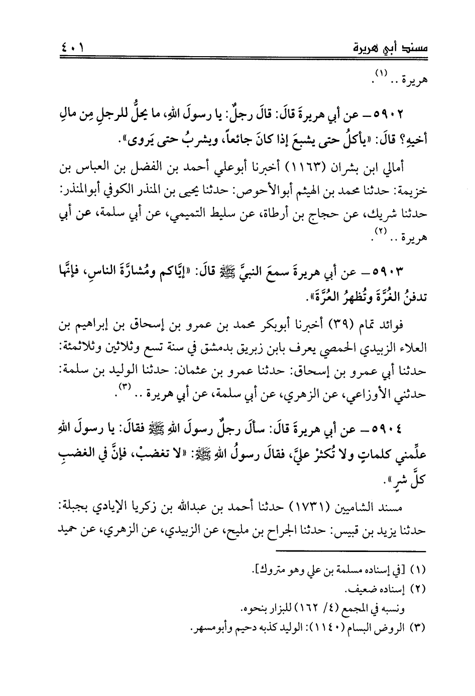 فوائد تمام (39) أخبرنا أبوبكر محمد بن عمرو بن إسحاق بن إبراهيم بن العلاء الزبيدي الحمصي يعرف بابن زبريق بدمشق في سنة تسع وثلاثين وثلاثمئة: حدثنا أبي عمرو بن إسحاق: حدثنا عمرو بن عثمان: حدثنا الوليد بن سلمة: حدثني الأوزاعي، عن الزهري، عن أبي سلمة، عن أبي هريرة .. (¬3).