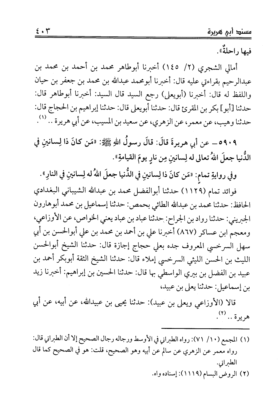 5909 - عن أبي هريرةَ قالَ: قالَ رسولُ اللهِ صلى الله عليه وسلم: «مَن كانَ ذا لِسانينِ في الدُّنيا جعلَ اللهُ تعالى له لِسانينِ مِن نارٍ يومَ القيامةِ».