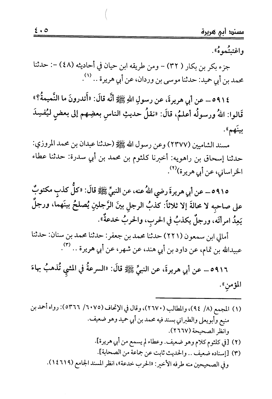5915 - عن أبي هريرةَ رضي اللهُ عنه، عن النبيِّ صلى الله عليه وسلم قالَ: «كلُّ كذبٍ مكتوبٌ على صاحبِه لا محالةَ إلا ثلاثاً: كذبُ الرجلِ بينَ الرَّجلينِ يُصلحُ بينَهما، ورجلٌ يَعِدُ امرأتَه، ورجلٌ يكذبُ في الحربِ، والحربُ خدعةٌ».