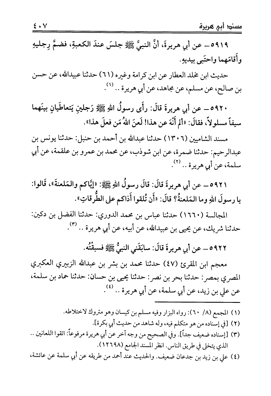 (¬3) [إسناده ضعيف جداً]. وفي الصحيح من وجه آخر عن أبي هريرة مرفوعاً: اتقوا اللعانين .. الذي يتخلى في طريق الناس. انظر المسند الجامع (12698).