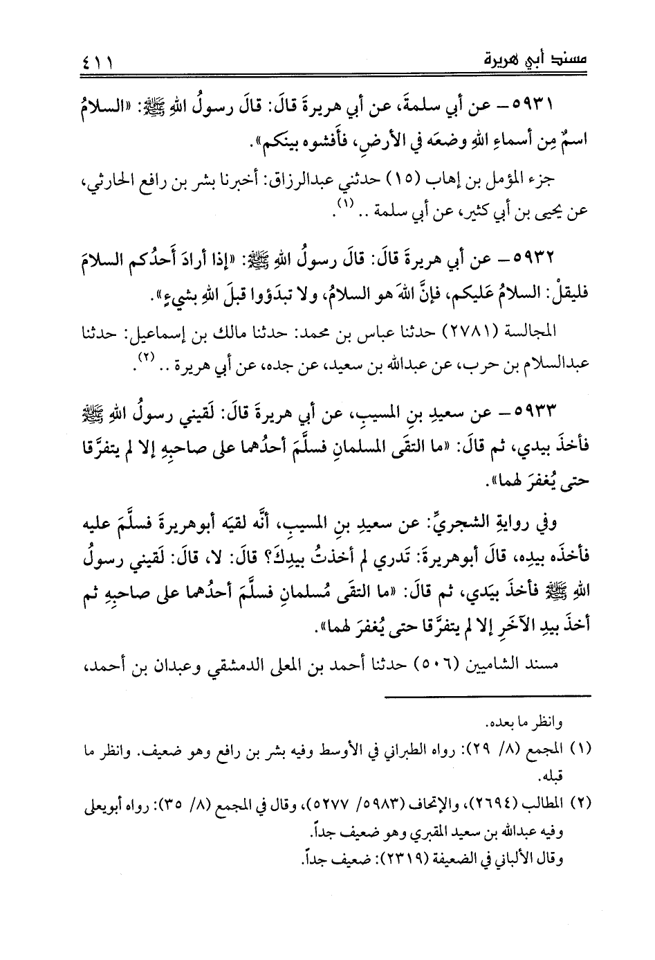 5933 - عن سعيدِ بنِ المسيبِ، عن أبي هريرةَ قالَ: لَقيني رسولُ اللهِ صلى الله عليه وسلم فأخذَ بيدي، ثم قالَ: «ما التقَى المسلمانِ فسلَّمَ أحدُهما على صاحبِهِ إلا لم يتفرَّقا حتى يُغفرَ لهما».