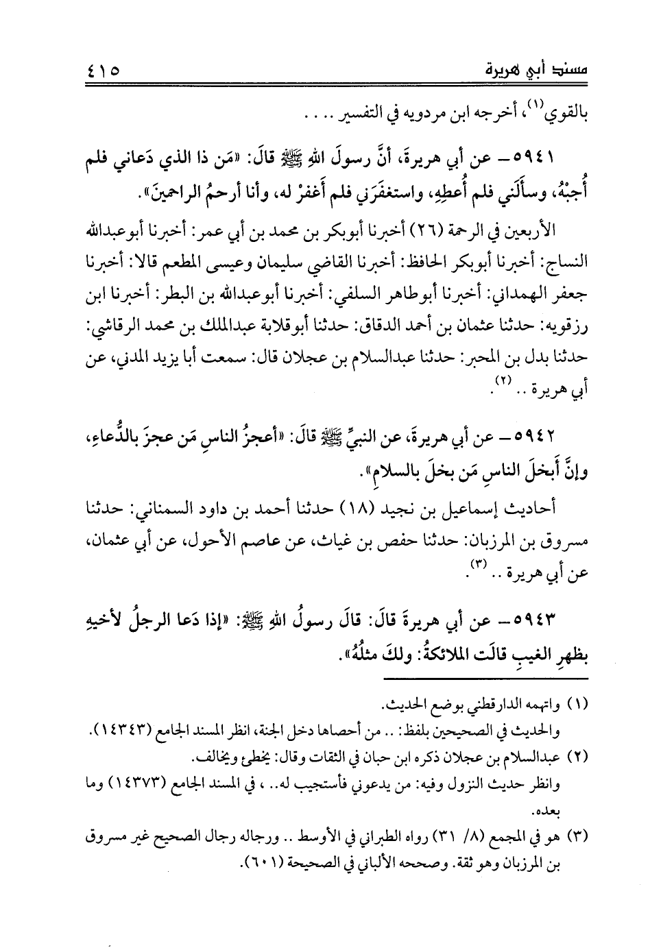الأربعين في الرحمة (26) أخبرنا أبوبكر بن محمد بن أبي عمر: أخبرنا أبوعبدالله النساج: أخبرنا أبوبكر الحافظ: أخبرنا القاضي سليمان وعيسى المطعم قالا: أخبرنا جعفر الهمداني: أخبرنا أبوطاهر السلفي: أخبرنا أبوعبدالله بن البطر: أخبرنا ابن رزقويه: حدثنا عثمان بن أحمد الدقاق: حدثنا أبوقلابة عبدالملك بن محمد الرقاشي: حدثنا بدل بن المحبر: حدثنا عبدالسلام بن عجلان قال: سمعت أبا يزيد المدني، عن أبي هريرة .. (¬2).