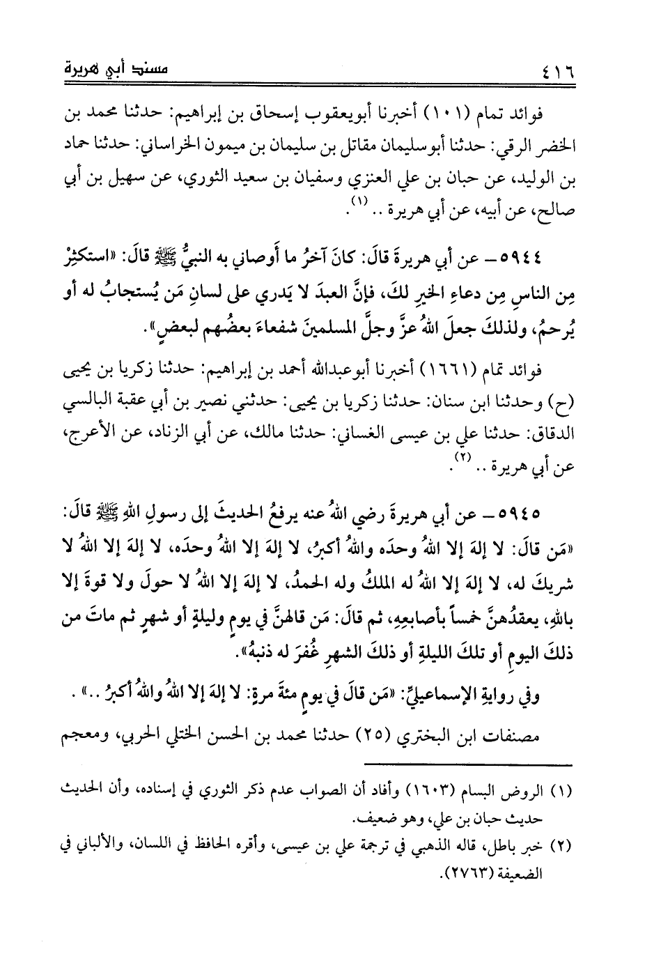 (¬1) الروض البسام (1603) وأفاد أن الصواب عدم ذكر الثوري في إسناده، وأن الحديث حديث حبان بن علي، وهو ضعيف.
