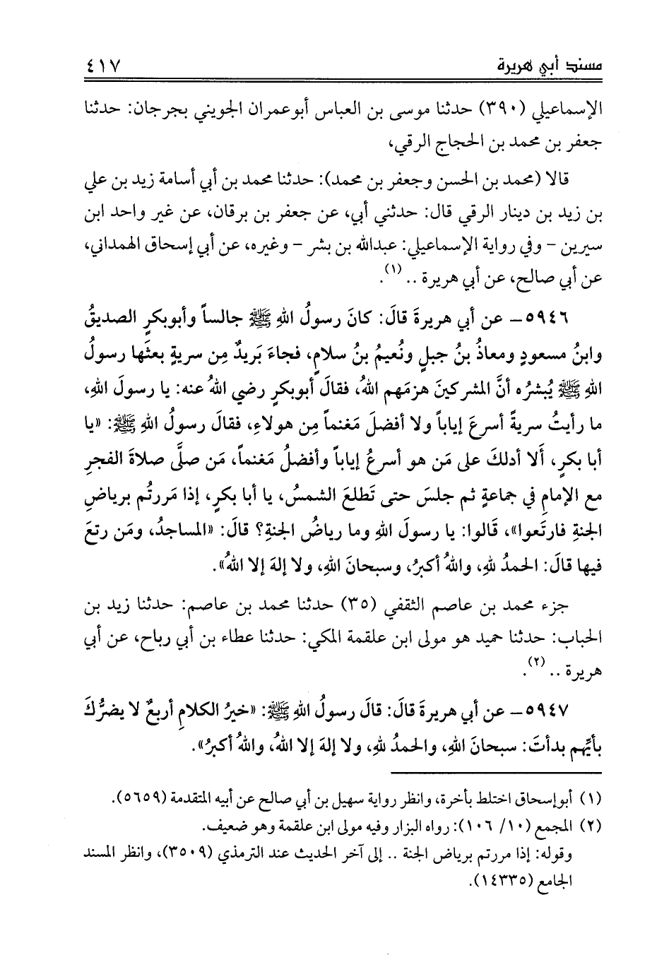 قالا (محمد بن الحسن وجعفر بن محمد): حدثنا محمد بن أبي أسامة زيد بن علي بن زيد بن دينار الرقي قال: حدثني أبي، عن جعفر بن برقان، عن غير واحد ابن سيرين - وفي رواية الإسماعيلي: عبدالله بن بشر - وغيره، عن أبي إسحاق الهمداني، عن أبي صالح، عن أبي هريرة .. (¬1).