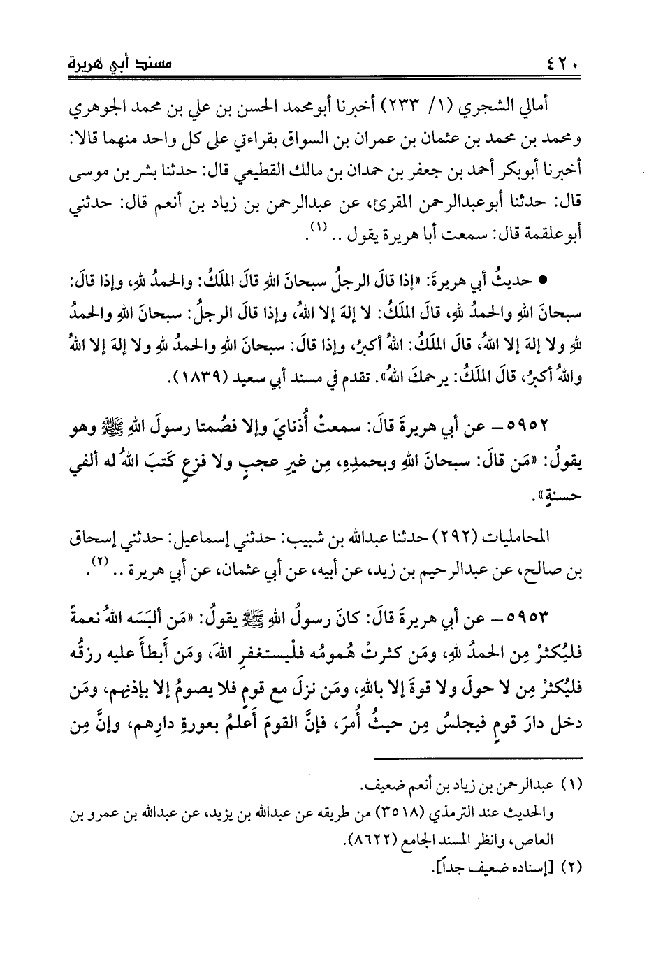 أمالي الشجري (1/ 233) أخبرنا أبومحمد الحسن بن علي بن محمد الجوهري ومحمد بن محمد بن عثمان بن عمران بن السواق بقراءتي على كل واحد منهما قالا: أخبرنا أبوبكر أحمد بن جعفر بن حمدان بن مالك القطيعي قال: حدثنا بشر بن موسى قال: حدثنا أبوعبدالرحمن المقرئ، عن عبدالرحمن بن زياد بن أنعم قال: حدثني أبوعلقمة قال: سمعت أبا هريرة يقول .. (¬1).