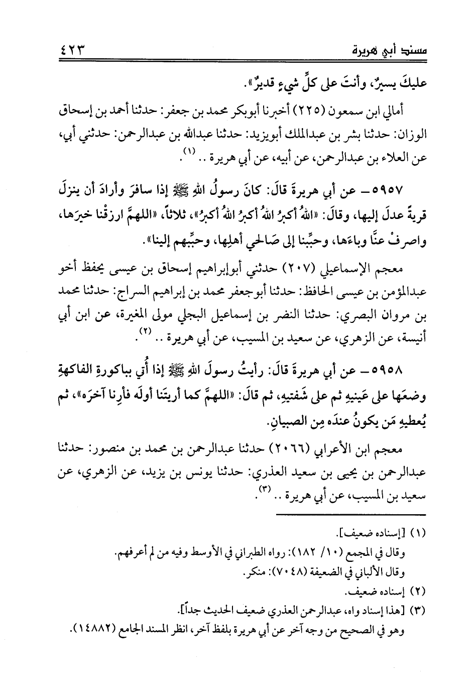 5957 - عن أبي هريرةَ قالَ: كانَ رسولُ اللهِ صلى الله عليه وسلم إذا سافرَ وأرادَ أن ينزلَ قريةً عدلَ إليها، وقالَ: «اللهُ أكبرُ اللهُ أكبرُ اللهُ أكبرُ»، ثلاثاً، «اللهمَّ ارزقْنا خيرَها، واصرفْ عنَّا وباءَها، وحبِّبنا إلى صَالحي أهلِها، وحبِّبهم إلينا».