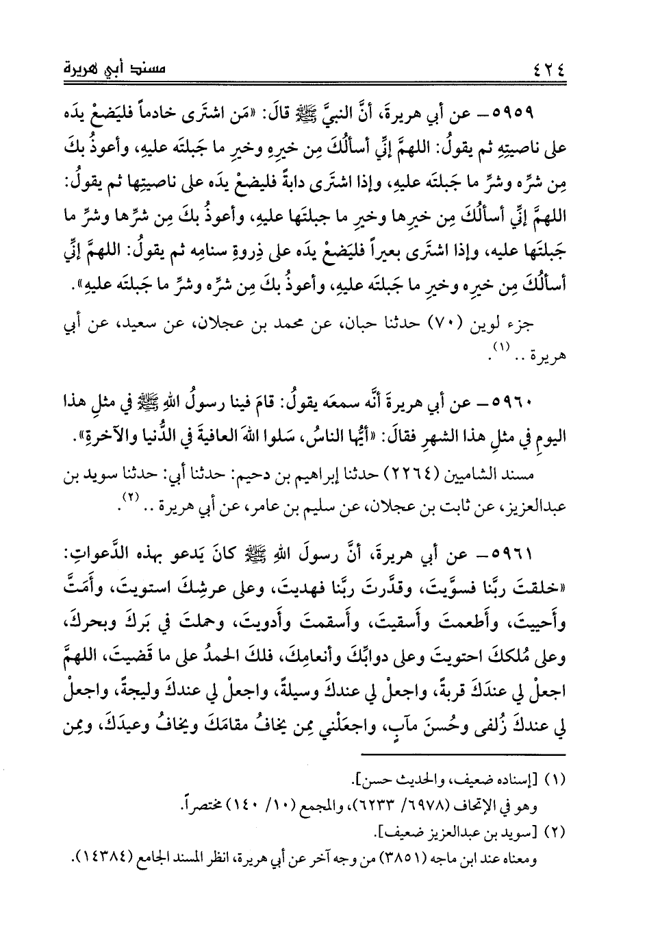 5959 - عن أبي هريرةَ، أنَّ النبيَّ صلى الله عليه وسلم قالَ: «مَن اشتَرى خادماً فليَضعْ يدَه على ناصيتِهِ ثم يقولُ: اللهمَّ إنِّي أسألُكَ مِن خيرِهِ وخيرِ ما جَبلتَه عليهِ، وأعوذُ بكَ مِن شرِّه وشرِّ ما جَبلتَه عليهِ، وإذا اشتَرى دابةً فليضعْ يدَه على ناصيتِها ثم يقولُ: اللهمَّ إنِّي أسألُكَ مِن خيرِها وخيرِ ما جبلتَها عليهِ، وأعوذُ بكَ مِن شرِّها وشرِّ ما جَبلتَها عليه، وإذا اشتَرى بعيراً فليَضعْ يدَه على ذِروةِ سنامِه ثم يقولُ: اللهمَّ إنِّي أسألُكَ مِن خيرِه وخيرِ ما جَبلتَه عليهِ، وأعوذُ بكَ مِن شرِّه وشرِّ ما جَبلتَه عليهِ».