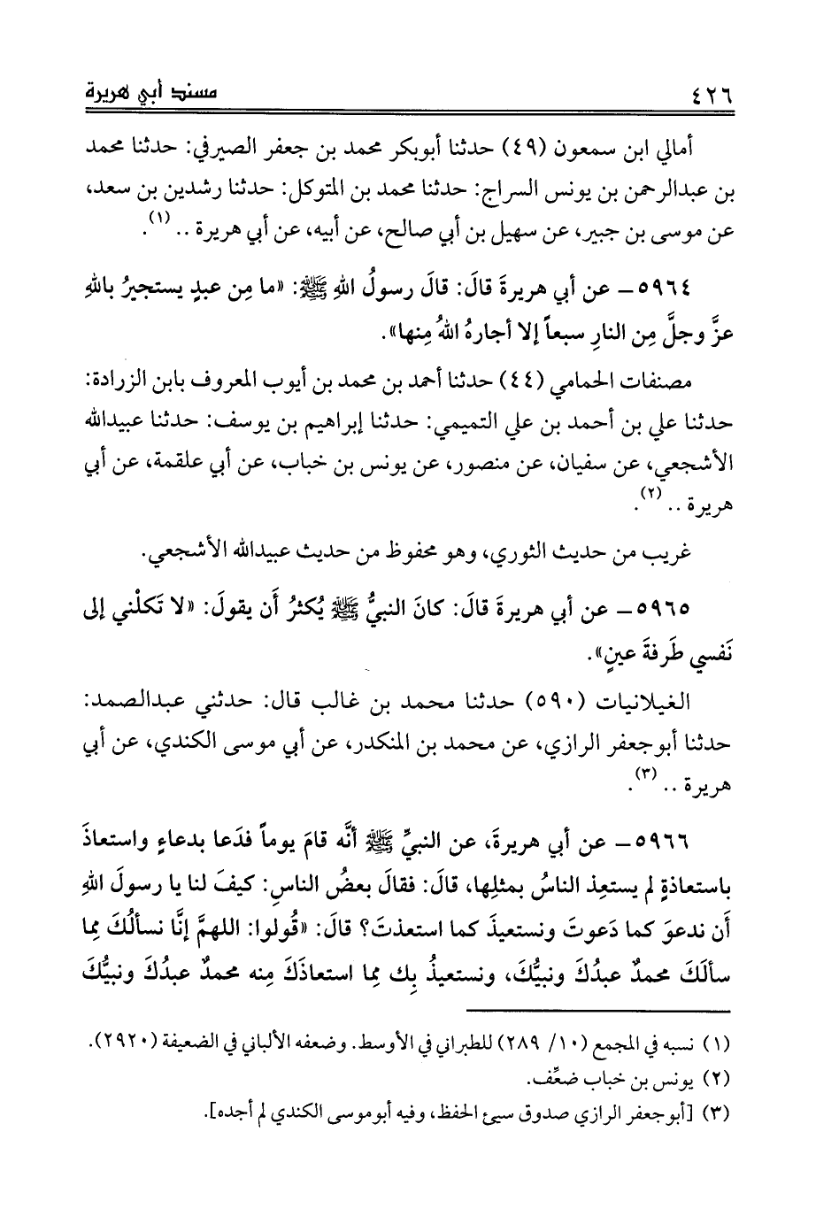 أمالي ابن سمعون (49) حدثنا أبوبكر محمد بن جعفر الصيرفي: حدثنا محمد بن عبدالرحمن بن يونس السراج: حدثنا محمد بن المتوكل: حدثنا رشدين بن سعد، عن موسى بن جبير، عن سهيل بن أبي صالح، عن أبيه، عن أبي هريرة .. (¬1).