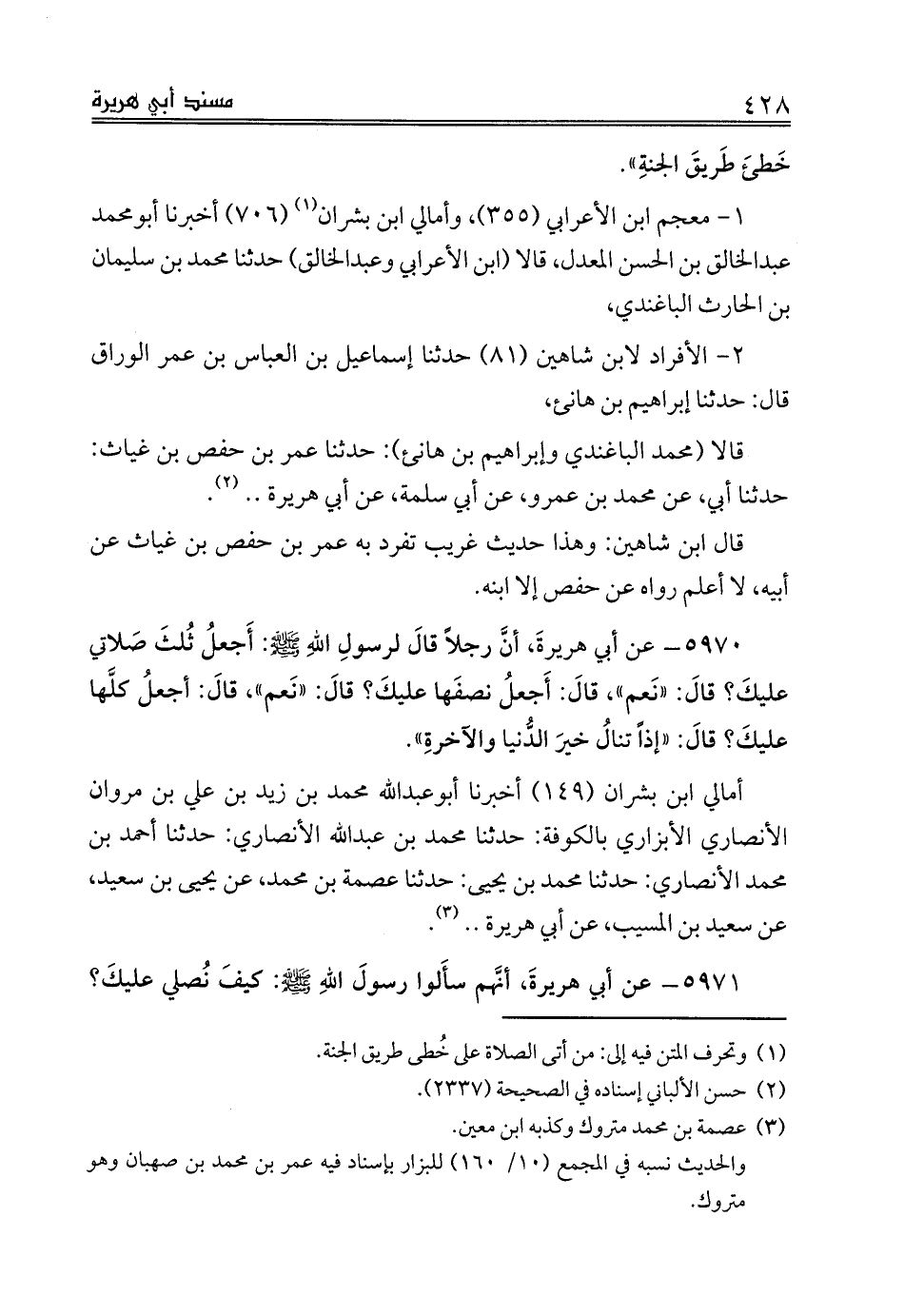 قالا (محمد الباغندي وإبراهيم بن هانئ): حدثنا عمر بن حفص بن غياث: حدثنا أبي، عن محمد بن عمرو، عن أبي سلمة، عن أبي هريرة .. (¬2).