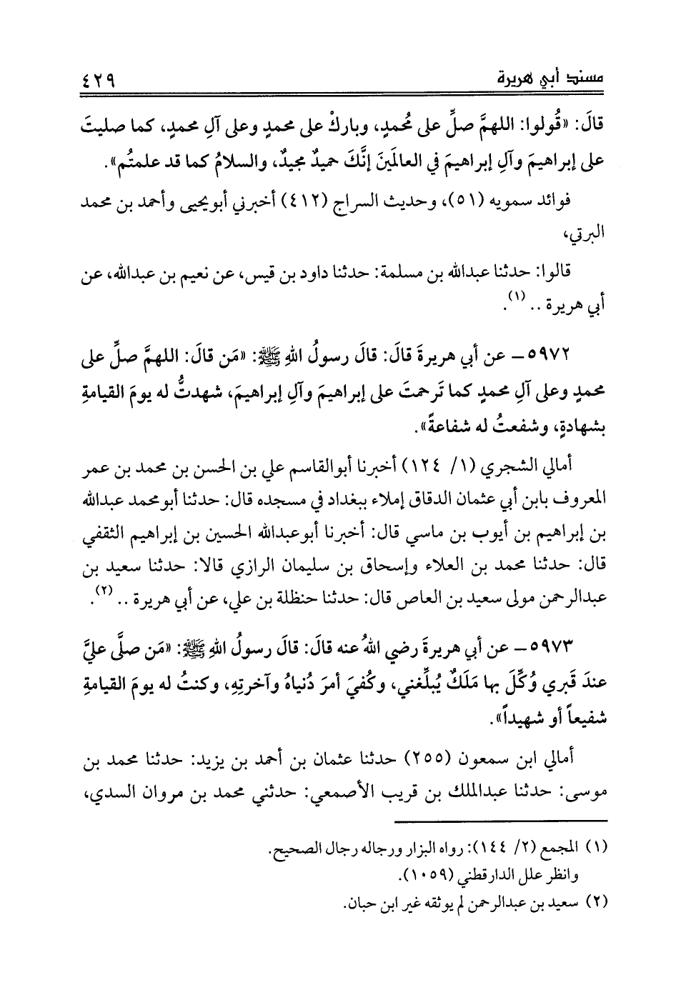 5972 - عن أبي هريرةَ قالَ: قالَ رسولُ اللهِ صلى الله عليه وسلم: «مَن قالَ: اللهمَّ صلِّ على محمدٍ وعلى آلِ محمدٍ كما تَرحمتَ على إبراهيمَ وآلِ إبراهيمَ، شهدتُ له يومَ القيامةِ بشهادةٍ، وشفعتُ له شفاعةً».