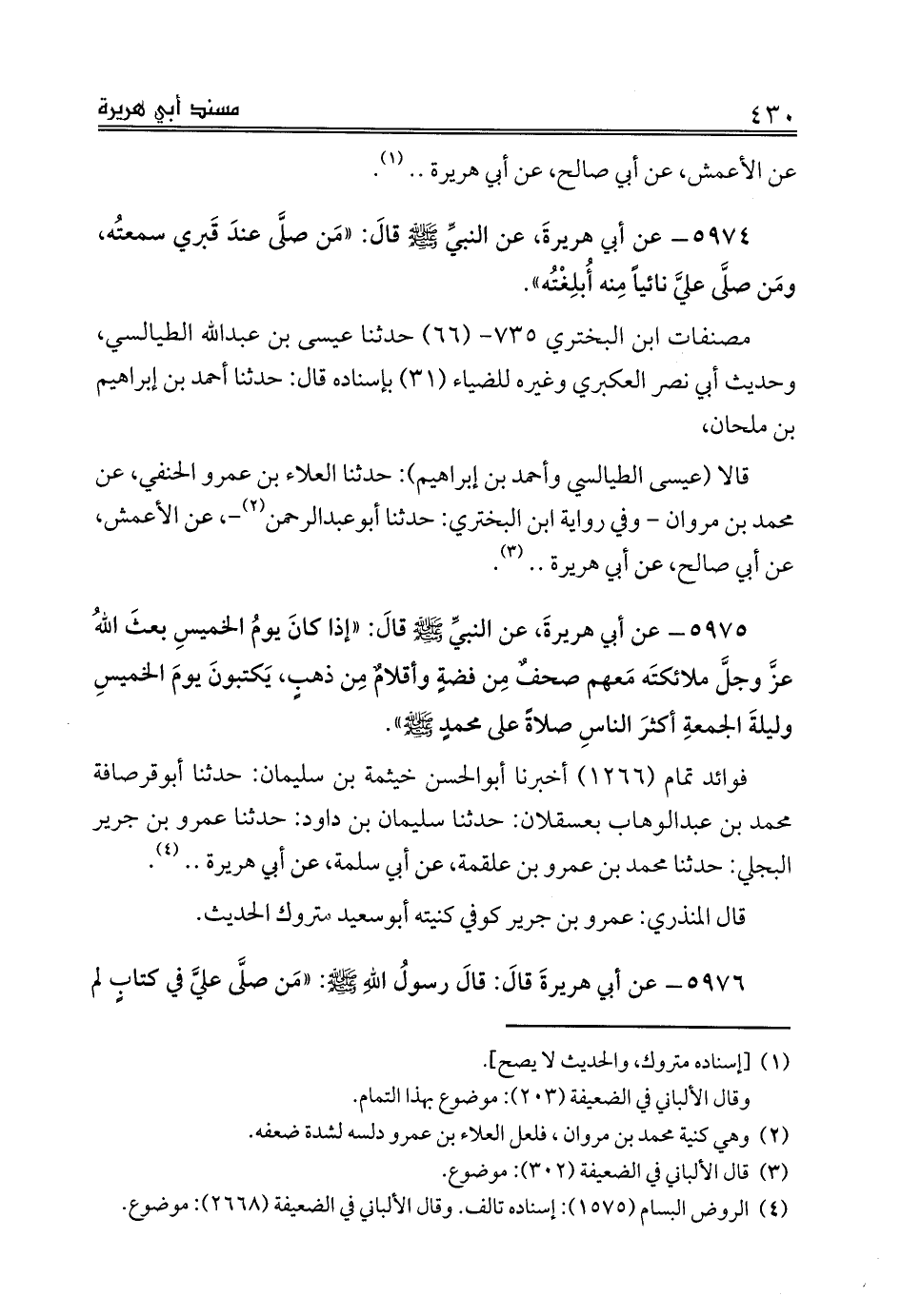 5976 - عن أبي هريرةَ قالَ: قالَ رسولُ اللهِ صلى الله عليه وسلم: «مَن صلَّى عليَّ في كتابٍ لم