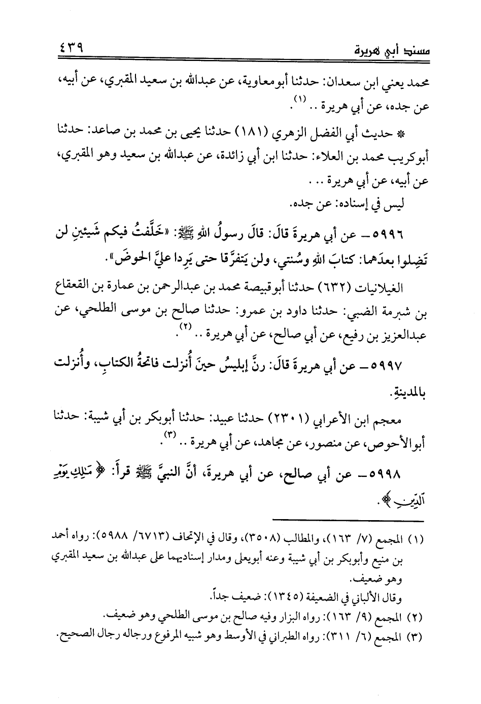 5996 - عن أبي هريرةَ قالَ: قالَ رسولُ اللهِ صلى الله عليه وسلم: «خَلَّفتُ فيكم شَيئينِ لن تَضِلوا بعدَهما: كتابَ اللهِ وسُنتي، ولن يَتفرَّقا حتى يَرِدا عليَّ الحوضَ».