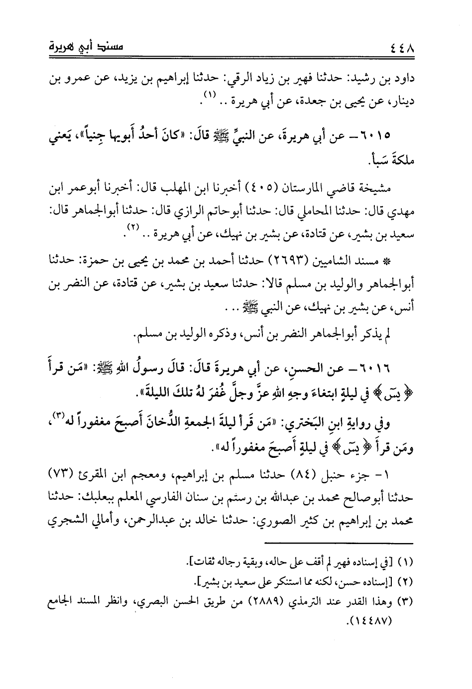 مشيخة قاضي المارستان (405) أخبرنا ابن المهلب قال: أخبرنا أبوعمر ابن مهدي قال: حدثنا المحاملي قال: حدثنا أبوحاتم الرازي قال: حدثنا أبوالجماهر قال: سعيد بن بشير، عن قتادة، عن بشير بن نهيك، عن أبي هريرة .. (¬2).