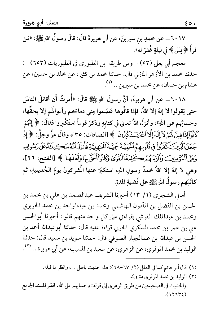 أمالي الشجري (1/ 13) أخبرنا الشريف عبدالصمد بن علي بن محمد بن الحسن بن الفضل بن المأمون الهاشمي ومحمد بن عبدالواحد بن محمد الحريري ومحمد بن عبدالملك القرشي بقراءتي على كل واحد منهم قالوا: أخبرنا أبوالحسن علي بن عمر بن محمد السكري الحربي قراءة عليه قال: حدثنا أبوعبدالله أحمد بن الحسن بن عبدالله بن عبدالجبار الصوفي قال: حدثنا سويد بن سعيد قال: حدثنا الوليد بن محمد الموقري، عن الزهري، عن سعيد بن المسيب، عن أبي هريرة .. (¬2).