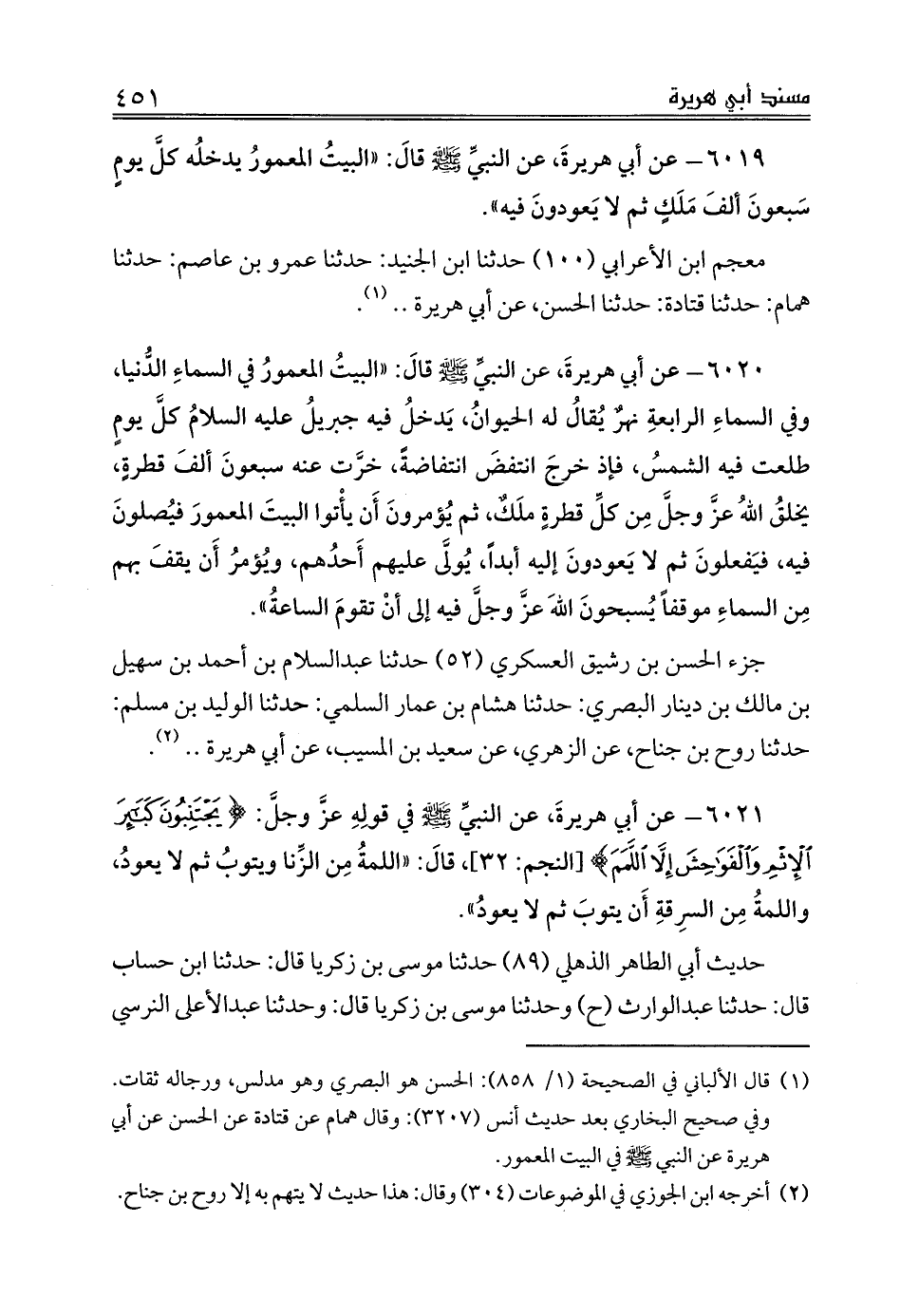 (¬1) قال الألباني في الصحيحة (1/ 858): الحسن هو البصري وهو مدلس، ورجاله ثقات. وفي صحيح البخاري بعد حديث أنس (3207): وقال همام عن قتادة عن الحسن عن أبي هريرة عن النبي صلى الله عليه وسلم في البيت المعمور.
