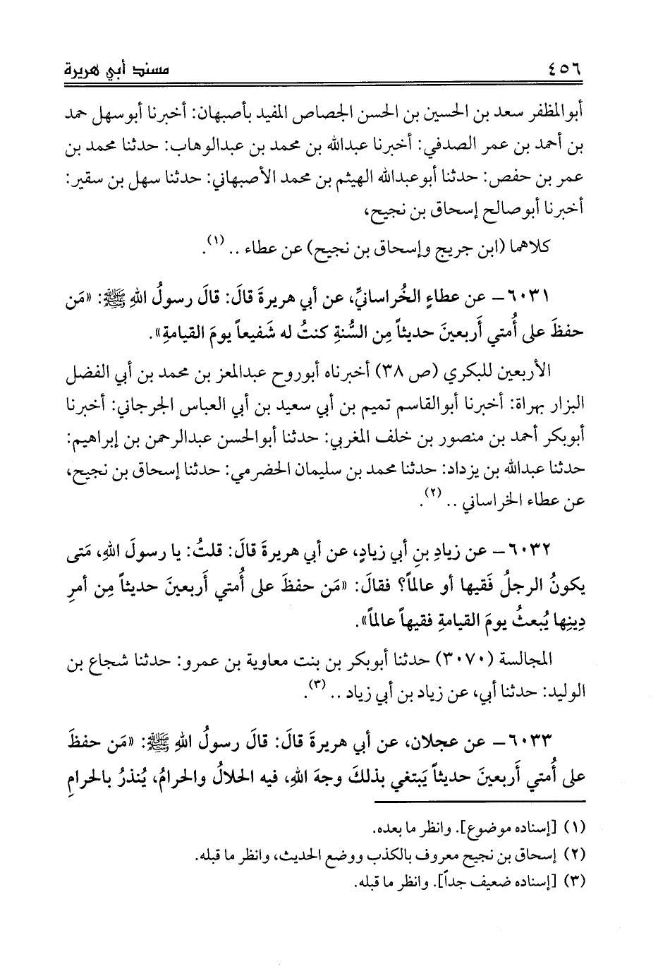 الأربعين للبكري (ص 38) أخبرناه أبوروح عبدالمعز بن محمد بن أبي الفضل البزار بهراة: أخبرنا أبوالقاسم تميم بن أبي سعيد بن أبي العباس الجرجاني: أخبرنا أبوبكر أحمد بن منصور بن خلف المغربي: حدثنا أبوالحسن عبدالرحمن بن إبراهيم: حدثنا عبدالله بن يزداد: حدثنا محمد بن سليمان الحضرمي: حدثنا إسحاق بن نجيح، عن عطاء الخراساني .. (¬2).