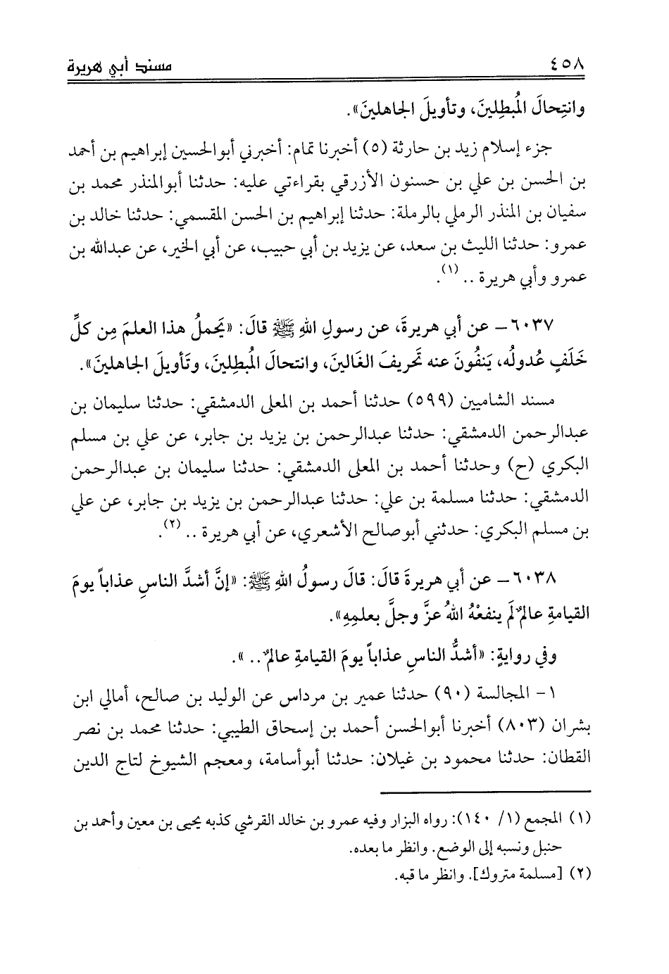6037 - عن أبي هريرةَ، عن رسولِ اللهِ صلى الله عليه وسلم قالَ: «يَحملُ هذا العلمَ مِن كلِّ خَلَفٍ عُدولُه، يَنفُونَ عنه تَحريفَ الغَالينَ، وانتحالَ المُبطِلينَ، وتَأويلَ الجاهلينَ».