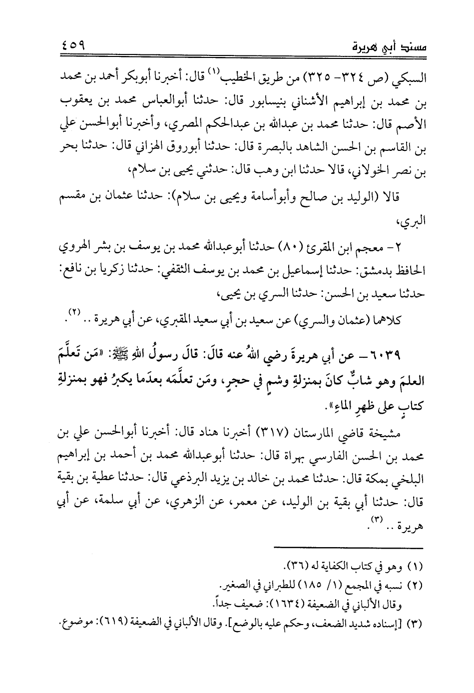 كلاهما (عثمان والسري) عن سعيد بن أبي سعيد المقبري، عن أبي هريرة .. (¬2).