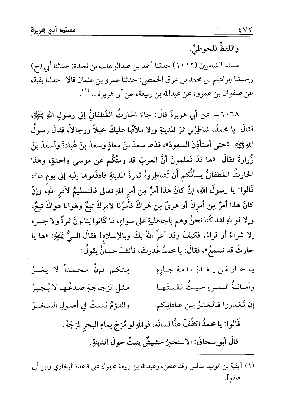 6068 - عن أبي هريرةَ قالَ: جاءَ الحارثُ الغَطفانيُّ إلى رسولِ اللهِ صلى الله عليه وسلم، فقالَ: يا محمدُ، شاطِرْني تمرَ المدينةِ وإلا ملأتُها عليكَ خيلاً ورجالاً، فقالَ رسولُ اللهِ صلى الله عليه وسلم: «حتى أستأذِنَ السعودَ»، فدَعا سعدَ بنَ معاذٍ وسعدَ بنَ عُبادةَ وأسعدَ بنَ زُرارةَ فقالَ: «ها قدْ تَعلمونَ أنَّ العربَ قد رمتْكُم عن موسى واحدةٍ، وهذا الحارثُ الغَطفانيُّ يسألُكم أَن تُشاطِروهُ ثمرةَ المدينةِ فادفَعوها إليه إلى يومٍ ما»، قَالوا: يا رسولَ اللهِ، إنْ كانَ هذا أمرٌ مِن أمرِ اللهِ تعالى فالتسليمُ لأمرِ اللهِ، وإنْ كانَ هذا أمرٌ مِن أمرِكَ أو هوىً مِن هَواكَ فأَمرُنا لأمرِكَ تبعٌ وهَوانا لهواكَ تبعٌ، وإلا فواللهِ لقد كُنا نحنُ وهم بالجاهليةِ على سواءٍ، ما كَانوا يَنالونَ تمرةً ولا جسره إلا شراءً أو قراءً، فكيفَ وقد أعزَّ اللهُ بكَ وبالإسلامِ! فقالَ النبيُّ صلى الله عليه وسلم: «ها يا حارثُ قد تسمعُ»، فقالَ: يا محمدُ غَدرتَ، فأنشدَ حسانُ يقولُ: