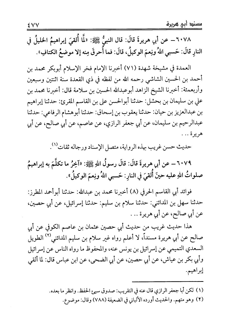 العمدة في مشيخة شهدة (71) أخبرنا الإمام فخر الإسلام أبوبكر محمد بن أحمد بن الحسين الشاشي رحمه الله من لفظه في ذي القعدة سنة اثنتين وسبعين وأربعمئة: أخبرنا الشيخ الزاهد أبوعبدالله الحسين بن سلامة قال: أخبرنا محمد بن علي بن سليمان بن بحشل: حدثنا أبوالحسن على بن القاسم المقرئ: حدثنا إبراهيم بن عبدالعزيز بن حيان: حدثنا يعقوب بن إسحاق: حدثنا أبوهشام الرفاعي: حدثنا عبدالرحيم بن سليمان، عن أبي جعفر الرازي، عن عاصم، عن أبي صالح، عن أبي هريرة .. .