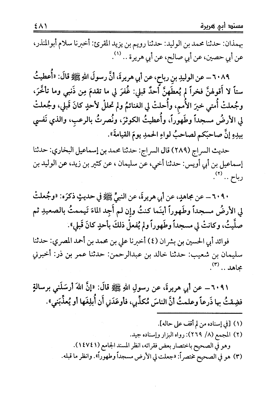 6090 - عن مجاهدٍ، عن أبي هريرةَ، عن النبيِّ صلى الله عليه وسلم في حديثٍ ذكرَه: «وجُعلتْ لي الأرضُ مسجداً وطَهوراً أينَما كنتُ وإِن لم أَجدِ الماءَ تَيممتُ بالصعيدِ ثم صلَّيتُ، وكانتْ لي مسجداً وطَهوراً ولم يُفعلْ ذلكَ بأحدٍ كانَ قَبلي».