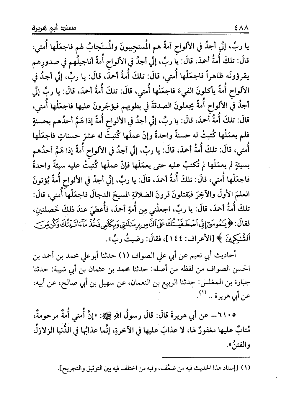 6105 - عن أبي هريرةَ قالَ: قالَ رسولُ اللهِ صلى الله عليه وسلم: «إنَّ أُمتي أُمةٌ مرحومةٌ، مُتابٌ عليها مغفورٌ لها، لا عذابَ عليها في الآخرةِ، إنَّما عذابُها في الدُّنيا الزلازلُ والفتنُ».