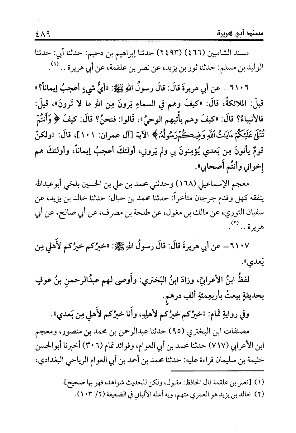 مسند الشاميين (466) (2493) حدثنا إبراهيم بن دحيم: حدثنا أبي: حدثنا الوليد بن مسلم: حدثنا ثور بن يزيد، عن نصر بن علقمة، عن أبي هريرة .. (¬1).