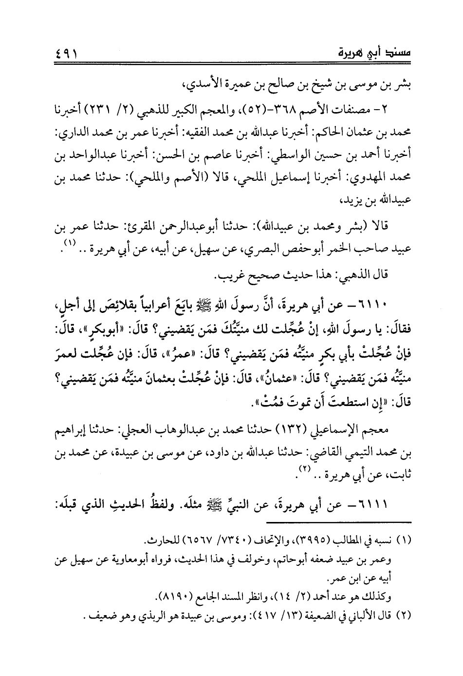 قالا (بشر ومحمد بن عبيدالله): حدثنا أبوعبدالرحمن المقرئ: حدثنا عمر بن عبيد صاحب الخمر أبوحفص البصري، عن سهيل، عن أبيه، عن أبي هريرة .. (¬1).