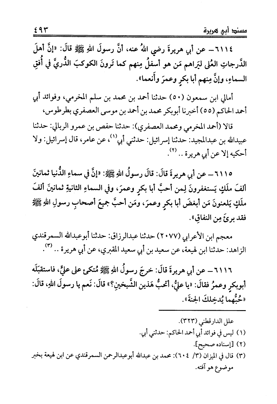 6114 - عن أبي هريرةَ رضي اللهُ عنه، أنَّ رسولَ اللهِ صلى الله عليه وسلم قالَ: «إنَّ أهلَ الدَّرجاتِ العُلى ليَراهم مَن هو أسفلُ مِنهم كما تَرونَ الكوكبَ الدُّريَّ في أُفقِ السماءِ، وإنَّ مِنهم أبا بكرٍ وعمرَ وأَنعِما».
