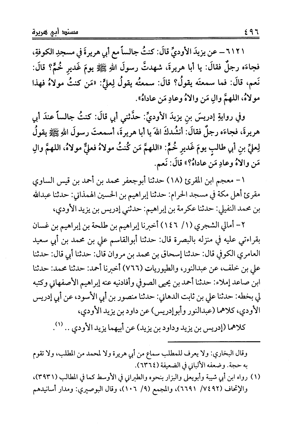 6121 - عن يزيدَ الأوديِّ قالَ: كنتُ جالساً مع أبي هريرةَ في مسجدِ الكوفةِ، فجاءَه رجلٌ فقالَ: يا أبا هريرةَ، شهدتَّ رسولَ اللهِ صلى الله عليه وسلم يومَ غَديرِ خُمٍّ؟ قالَ: نَعم، قالَ: فما سمعتَه يقولُ؟ قالَ: سمعتُه يقولُ لِعليٍّ: «مَن كنتُ مولاهُ فهذا مولاهُ، اللهمَّ والِ مَن والاهُ وعادِ مَن عاداهُ».