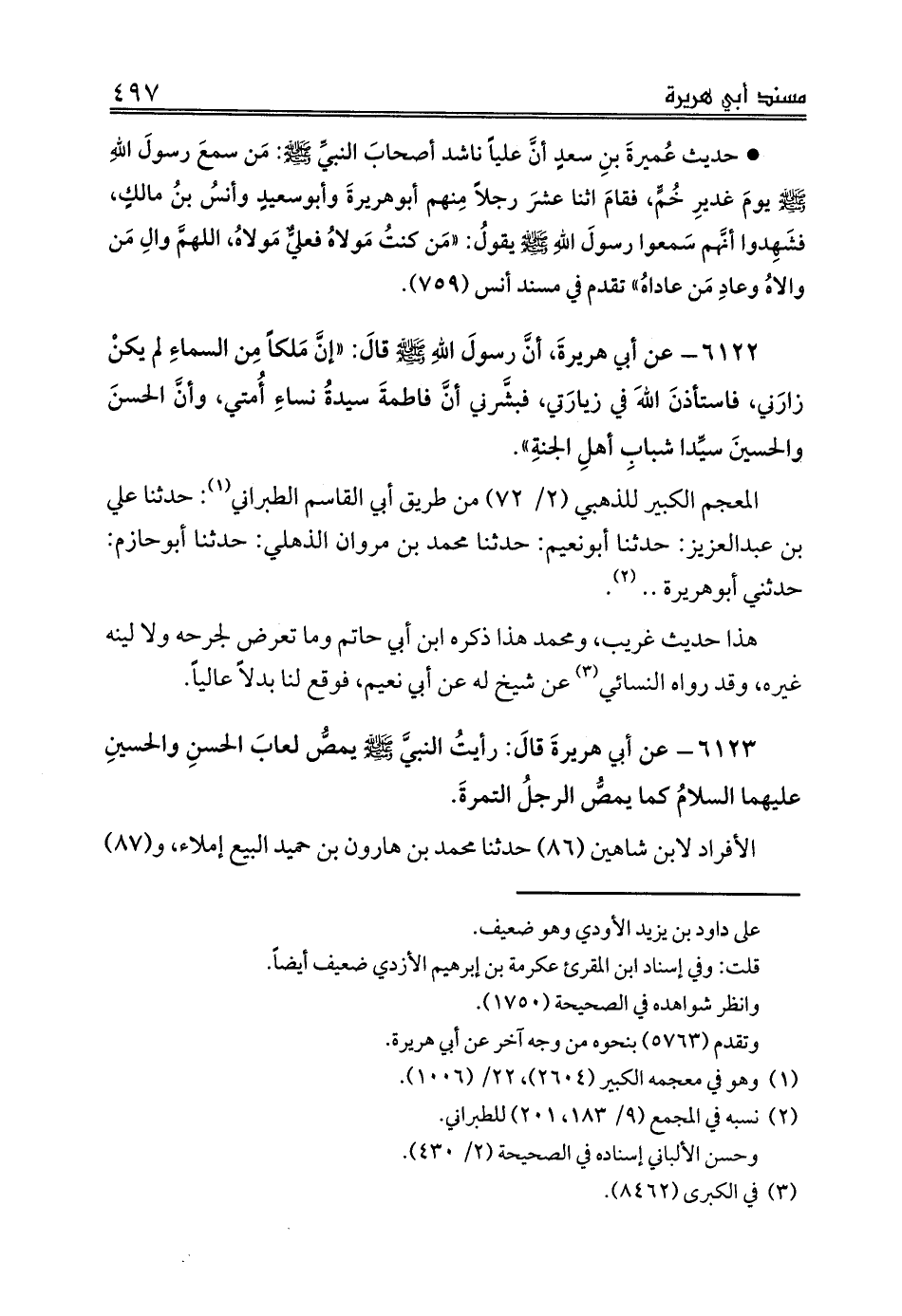* حديث عُميرةَ بنِ سعدٍ أنَّ علياً ناشد أصحابَ النبيِّ صلى الله عليه وسلم: مَن سمعَ رسولَ اللهِ صلى الله عليه وسلم يومَ غديرِ خُمٍّ، فقامَ اثنا عشرَ رجلاً مِنهم أبوهريرةَ وأبوسعيدٍ وأنسُ بنُ مالكٍ، فشَهِدوا أنَّهم سَمعوا رسولَ اللهِ صلى الله عليه وسلم يقولُ: «مَن كنتُ مَولاهُ فعليٌّ مَولاهُ، اللهمَّ والِ مَن والاهُ وعادِ مَن عاداهُ» تقدم في مسند أنس (759).