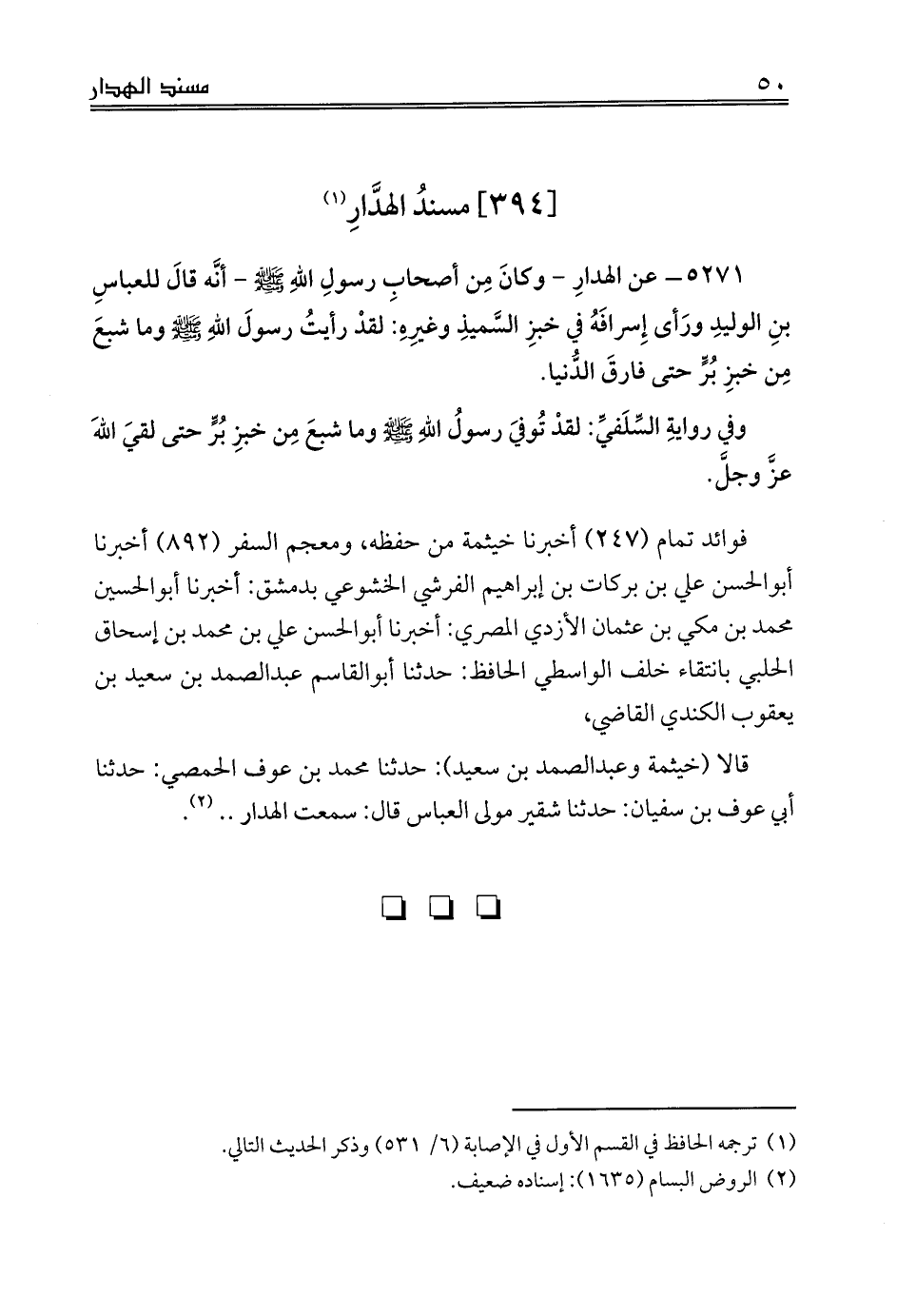 5271 - عن الهدارِ - وكانَ مِن أصحابِ رسولِ اللهِ صلى الله عليه وسلم - أنَّه قالَ للعباسِ بنِ الوليدِ ورَأى إِسرافَهُ في خبزِ السَّميذِ وغيرِهِ: لقدْ رأيتُ رسولَ اللهِ صلى الله عليه وسلم وما شبعَ مِن خبزِ بُرٍّ حتى فارقَ الدُّنيا.