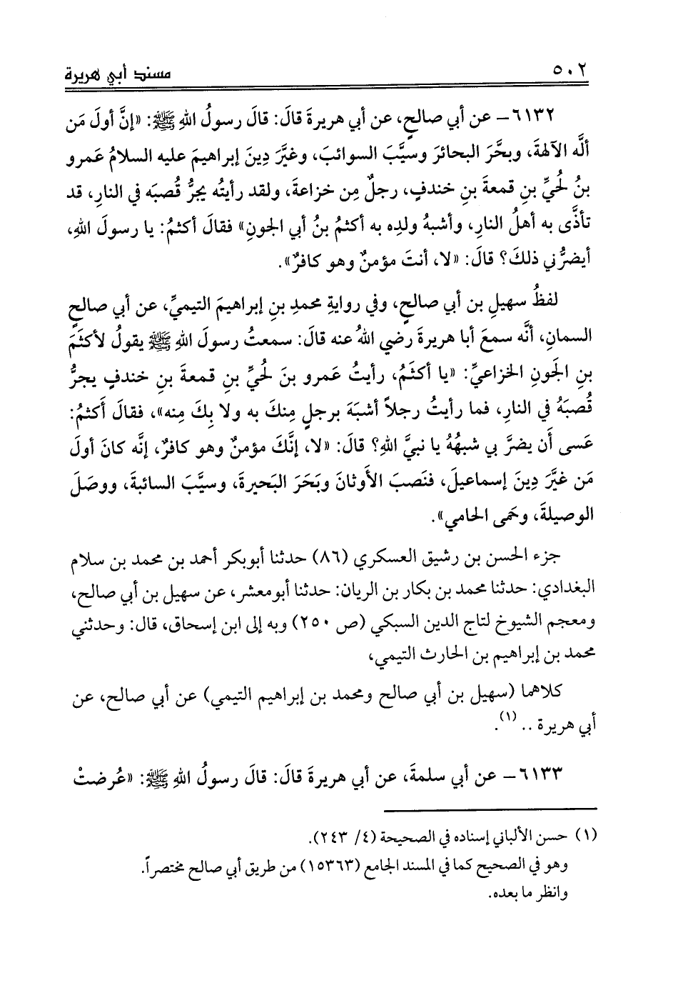 6132 - عن أبي صالحٍ، عن أبي هريرةَ قالَ: قالَ رسولُ اللهِ صلى الله عليه وسلم: «إنَّ أولَ مِن ألَّه الآلهةَ، وبحَّرَ البحائرَ وسيَّبَ السوائبَ، وغيَّرَ دِينَ إبراهيمَ عليه السلامُ عَمرو بنُ لُحيِّ بنِ قمعةَ بنِ خندفٍ، رجلٌ مِن خزاعةَ، ولقد رأيتُه يجرُّ قُصبَه في النارِ، قد تأذَّى به أهلُ النارِ، وأشبهُ ولدِه به أكثمُ بنُ أبي الجونِ» فقالَ أكثمُ: يا رسولَ اللهِ، أيضرُّني ذلكَ؟ قالَ: «لا، أنتَ مؤمنٌ وهو كافرٌ».