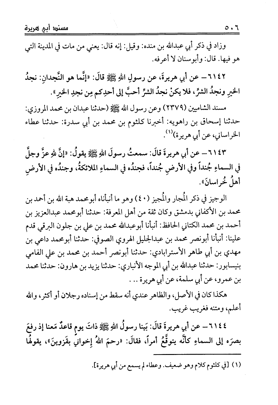 مسند الشاميين (2379) وعن رسول الله صلى الله عليه وسلم (حدثنا عبدان بن محمد المروزي: حدثنا إسحاق بن راهويه: أخبرنا كلثوم بن محمد بن أبي سدرة: حدثنا عطاء الخراساني، عن أبي هريرة) (¬1).