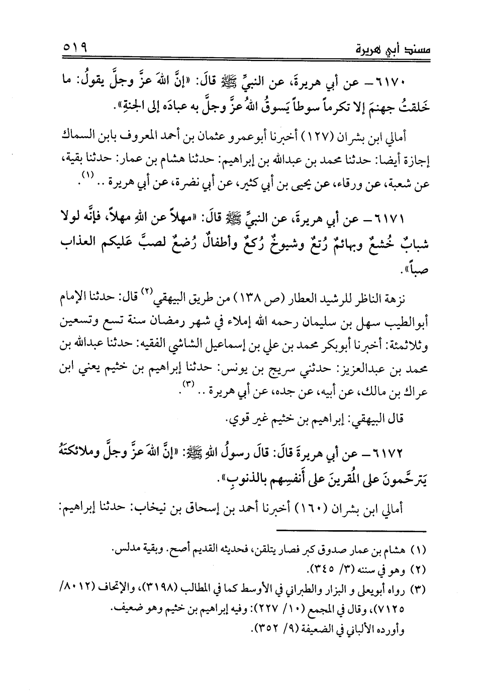 نزهة الناظر للرشيد العطار (ص 138) من طريق البيهقي (¬2) قال: حدثنا الإمام أبوالطيب سهل بن سليمان رحمه الله إملاء في شهر رمضان سنة تسع وتسعين وثلاثمئة: أخبرنا أبوبكر محمد بن علي بن إسماعيل الشاشي الفقيه: حدثنا عبدالله بن محمد بن عبدالعزيز: حدثني سريج بن يونس: حدثنا إبراهيم بن خثيم يعني ابن عراك بن مالك، عن أبيه، عن جده، عن أبي هريرة .. (¬3).