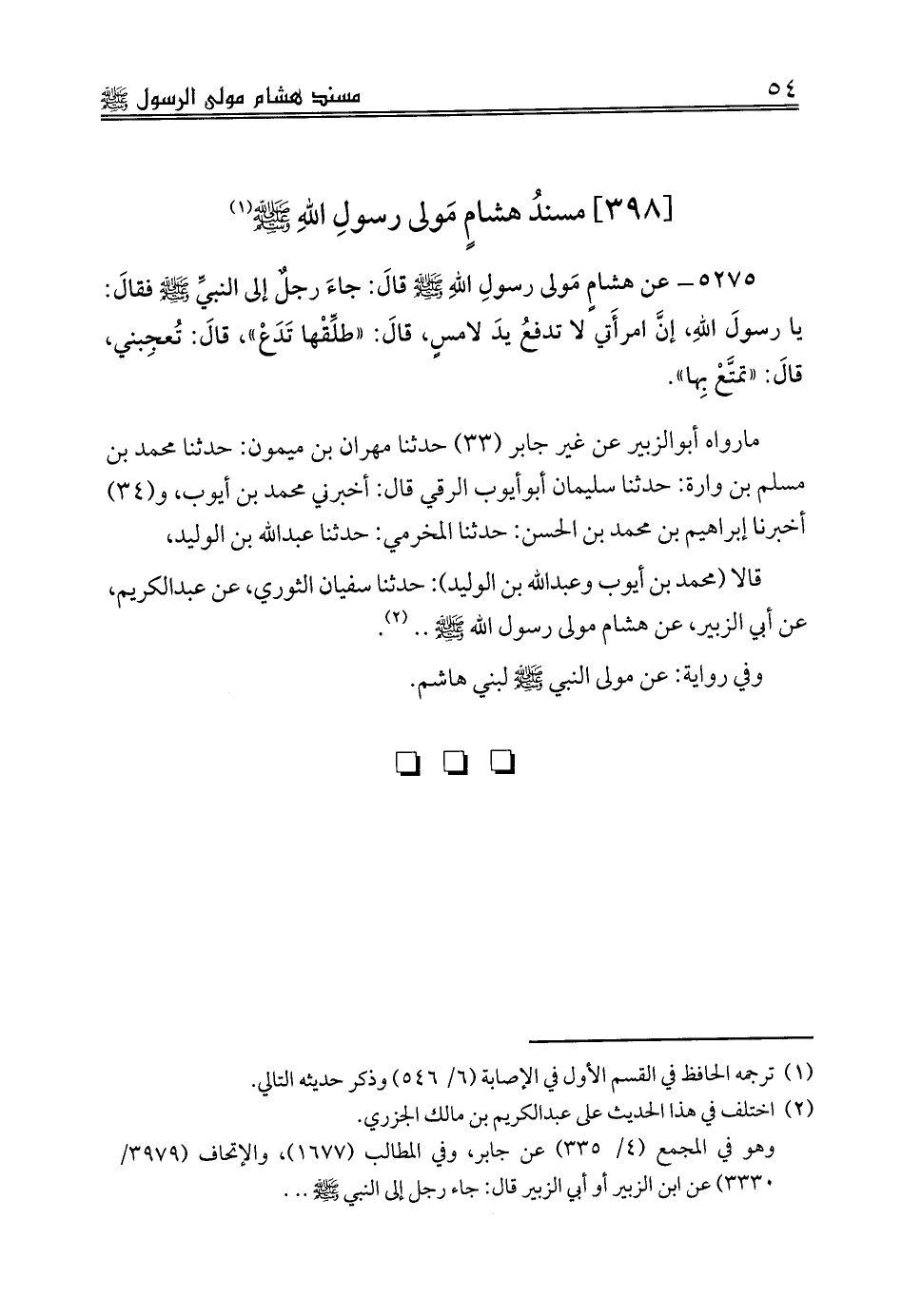 قالا (محمد بن أيوب وعبدالله بن الوليد): حدثنا سفيان الثوري، عن عبدالكريم، عن أبي الزبير، عن هشام مولى رسول الله صلى الله عليه وسلم .. (¬2).
