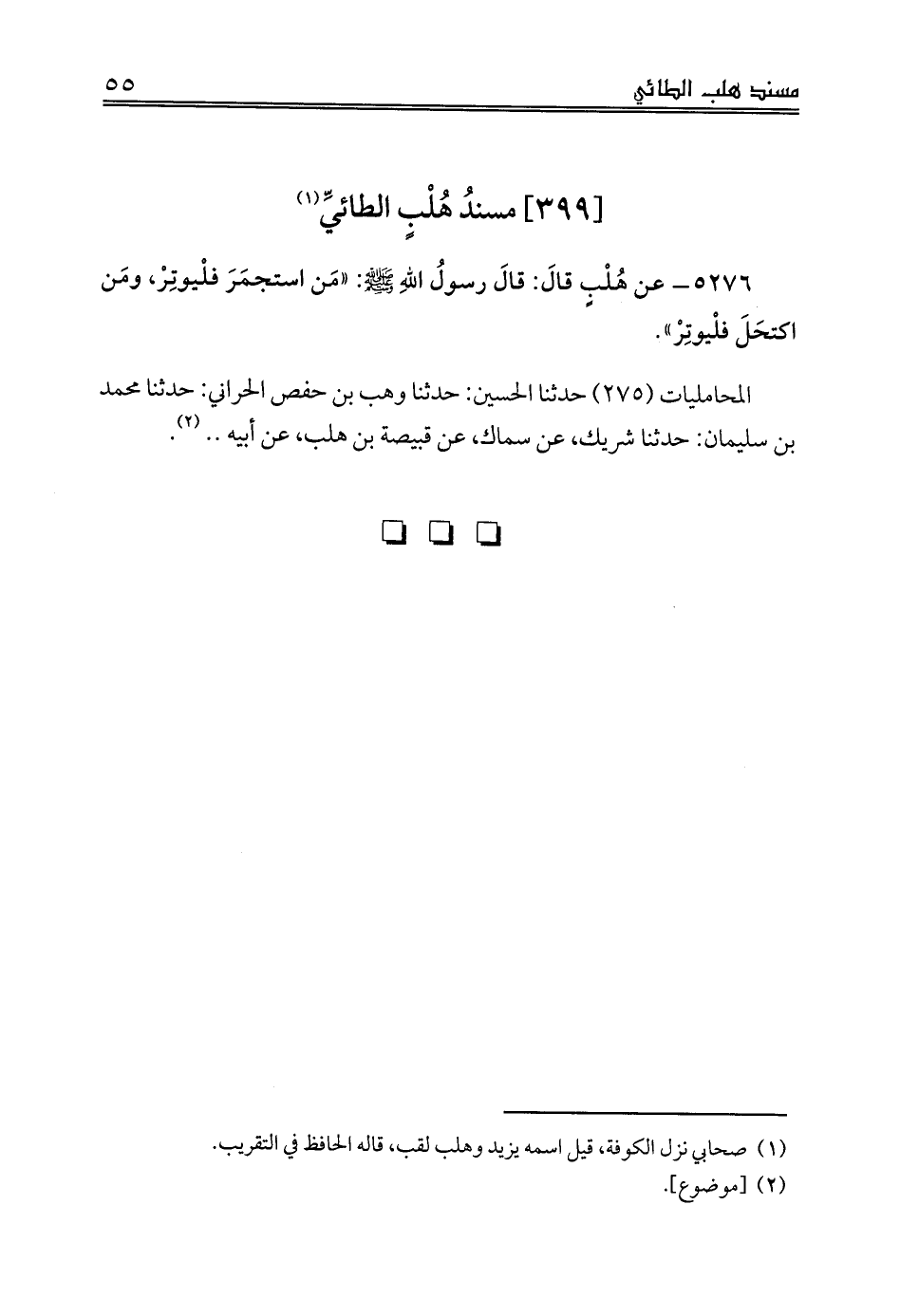 5276 - عن هُلْبٍ قالَ: قالَ رسولُ اللهِ صلى الله عليه وسلم: «مَن استجمَرَ فلْيوتِرْ، ومَن اكتحَلَ فلْيوتِرْ».