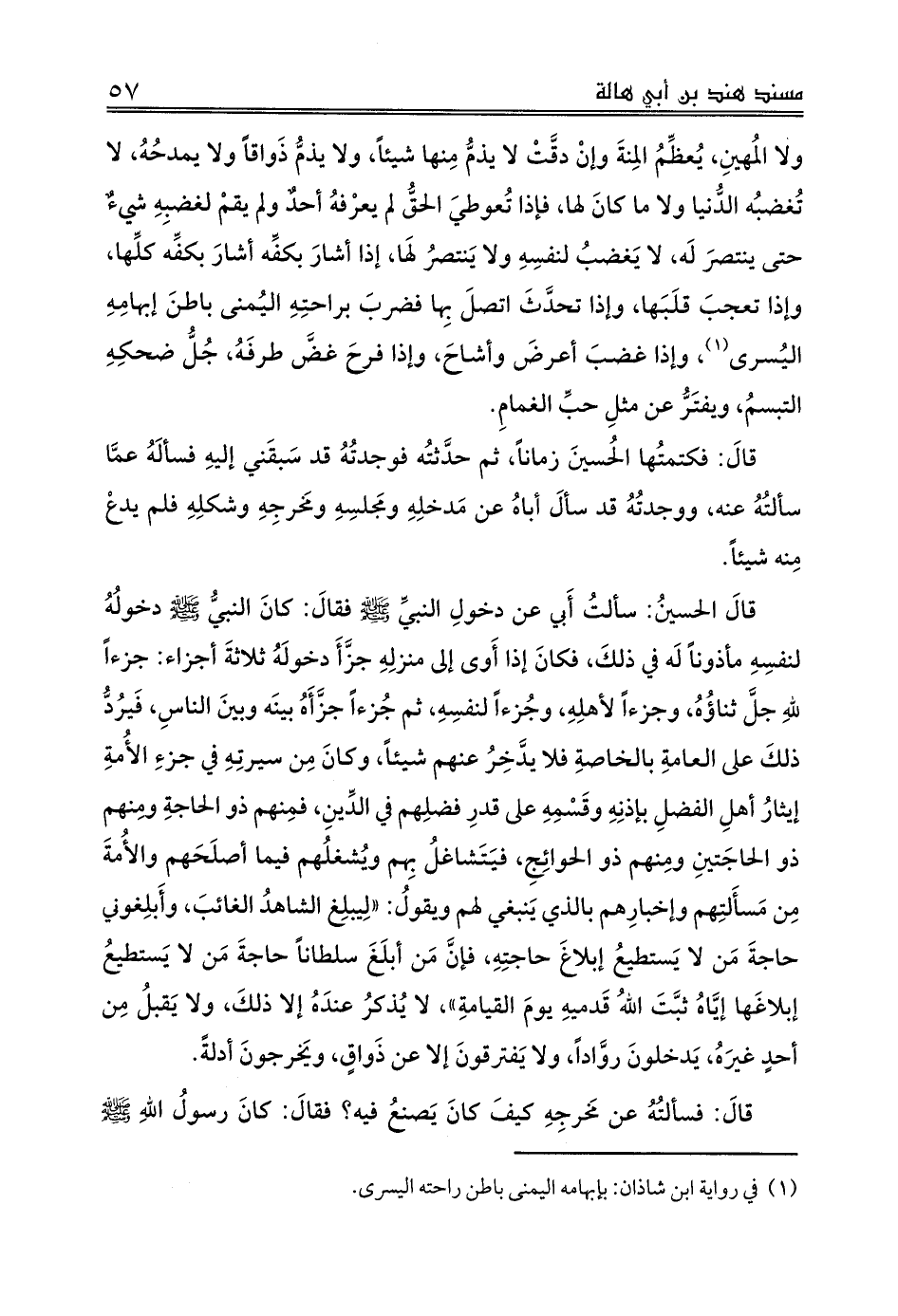 قالَ الحسينُ: سألتُ أَبي عن دخولِ النبيِّ صلى الله عليه وسلم فقالَ: كانَ النبيُّ صلى الله عليه وسلم دخولُهُ لنفسِهِ مأذوناً لَه في ذلكَ، فكانَ إذا أَوى إلى منزلِهِ جزَّأَ دخولَهُ ثلاثةَ أجزاء: جزءاً للهِ جلَّ ثناؤُهُ، وجزءاً لأهلِهِ، وجُزءاً لنفسِهِ، ثم جُزءاً جزَّأَهُ بينَه وبينَ الناسِ، فَيرُدُّ ذلكَ على العامةِ بالخاصةِ فلا يدَّخِرُ عنهم شيئاً، وكانَ مِن سيرتِهِ في جزءِ الأُمةِ إيثارُ أهلِ الفضلِ بإذنِهِ وقَسْمِهِ على قدرِ فضلِهم في الدِّينِ، فمِنهم ذو الحاجةِ ومِنهم ذو الحاجَتينِ ومِنهم ذو الحوائِجِ، فيَتَشاغلُ بِهم ويُشغلُهم فيما أصلَحَهم والأُمةَ مِن مَسأَلتِهم وإخبارِهم بالذي يَنبغي لهم ويقولُ: «لِيبلِغ الشاهدُ الغائبَ، وأَبلِغوني حاجةَ مَن لا يَستطيعُ إبلاغَ حاجتِهِ، فإنَّ مَن أبلَغَ سلطاناً حاجةَ مَن لا يَستطيعُ إبلاغَها إيَّاهُ ثبَّتَ اللهُ قَدميهِ يومَ القيامةِ»، لا يُذكرُ عندَهُ إلا ذلكَ، ولا يَقبلُ مِن أحدٍ غيرَهُ، يَدخلونَ روَّاداً، ولا يَفترقونَ إلا عن ذَواقٍ، ويَخرجونَ أدلةً.