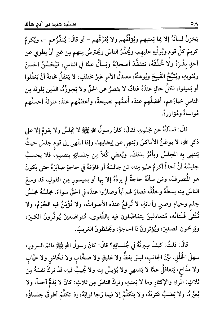 قالَ: فسألتُهُ عن مَجلسِهِ، فقالَ: كانَ رسولُ اللهِ صلى الله عليه وسلم لا يَجلسُ ولا يقومُ إلا على ذكرِ اللهِ، لا يوطنُ الأماكنَ ويَنهي عن إيطانِها، وإذا انتَهى إلى قومٍ جلسَ حيثُ يَنتهي بِه المجلسُ ويأمُرُ بذلكَ، ويُعطي كُلاً مِن جلسائِهِ بنصيبِهِ، فلا يحسبُ جليسُهُ أنَّ أحداً أكرمُ عليهِ مِنه، مَن جالسَهُ أو قاوَمَهُ في حاجةٍ صابَرَهُ حتى يكونَ هو المُنصرفَ، ومَن سألَهُ حاجةً لم يردَّهُ إلا بِها أو بميسورٍ مِن القولِ، قد وسعَ الناسَ مِنه بسطُهُ وخلُقُه فصارَ لهم أباً وصارُوا عندَه في الحقِّ سواءً، مجلسُهُ مجلسُ حِلمٍ وحياءٍ وصبرٍ وأمانةٍ، لا تُرفعُ عندَه الأصواتُ، ولا تُؤْبَنُ فيه الحُرَمُ، ولا تُنْثى فَلَتاتُه، مُتعادلينَ يتفاضَلون فيه بالتَّقوى، مُتواضعينَ يُوقِّرونَ الكبيرَ، ويَرحَمون الصغيرَ، ويُؤثرونَ ذا الحاجةِ، ويَحفظونَ الغريبَ.