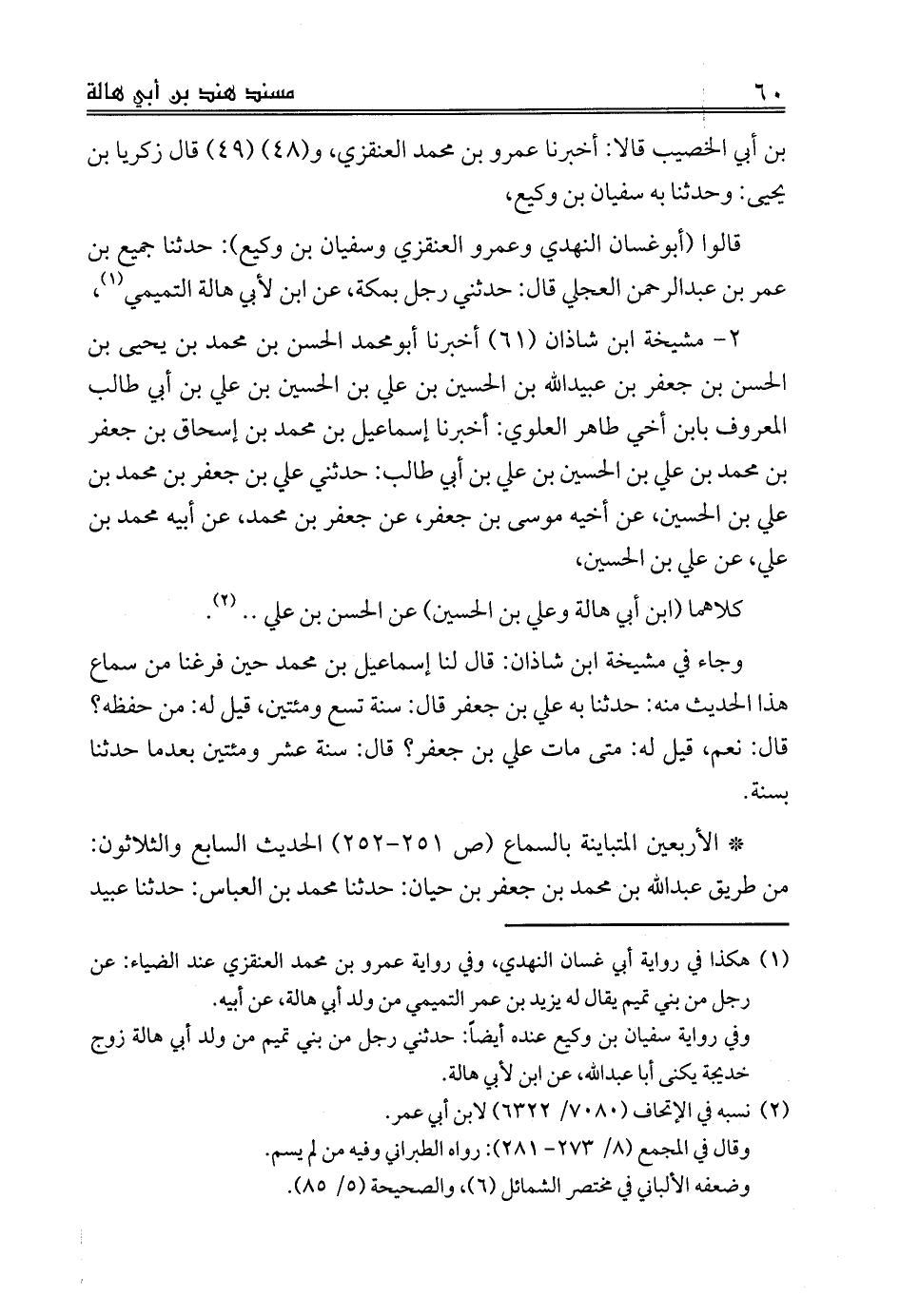 وفي رواية سفيان بن وكيع عنده أيضاً: حدثني رجل من بني تميم من ولد أبي هالة زوج خديجة يكنى أبا عبدالله، عن ابن لأبي هالة.