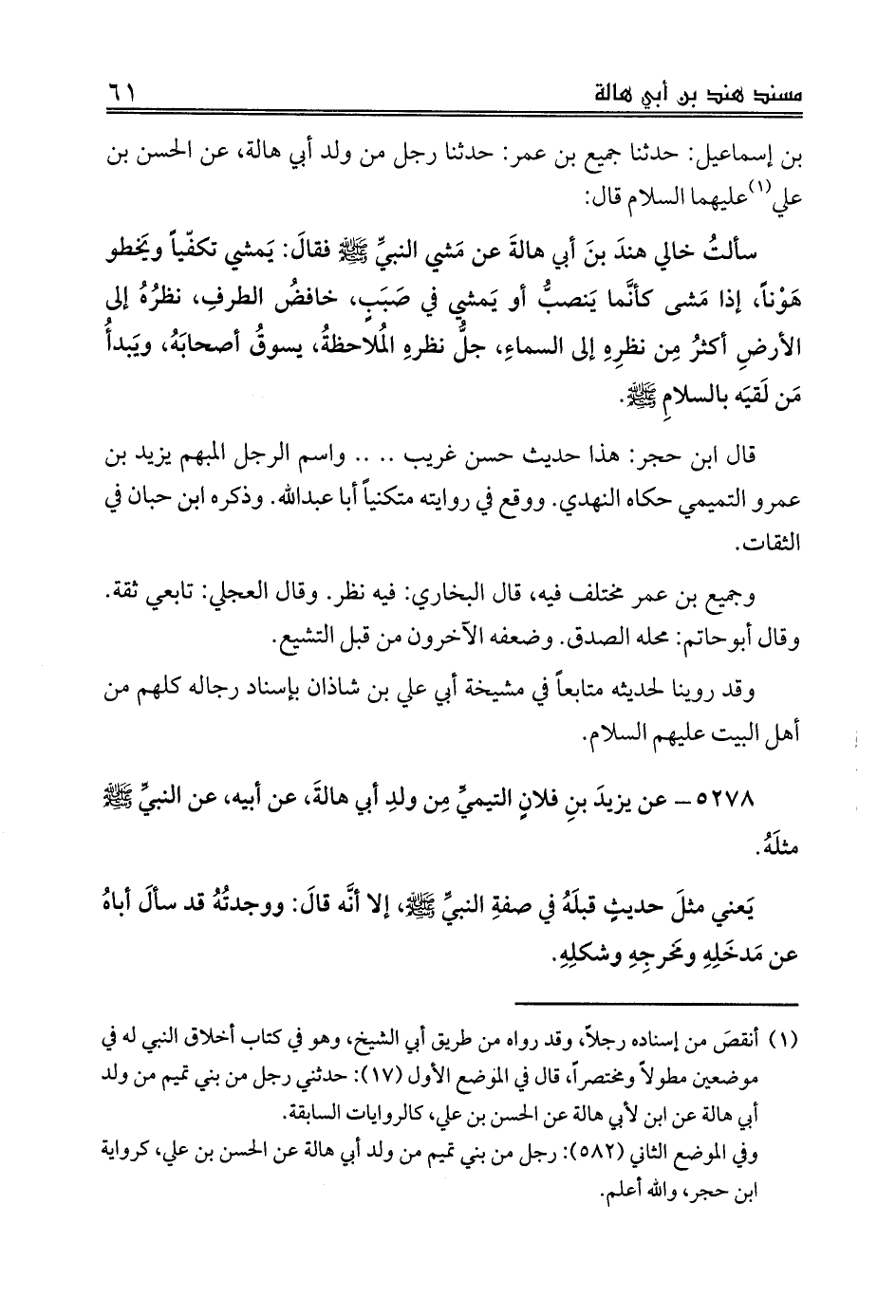 (¬1) أنقصَ من إسناده رجلاً، وقد رواه من طريق أبي الشيخ، وهو في كتاب أخلاق النبي له في موضعين مطولاً ومختصراً، قال في الموضع الأول (17): حدثني رجل من بني تميم من ولد أبي هالة عن ابن لأبي هالة عن الحسن بن علي، كالروايات السابقة.
