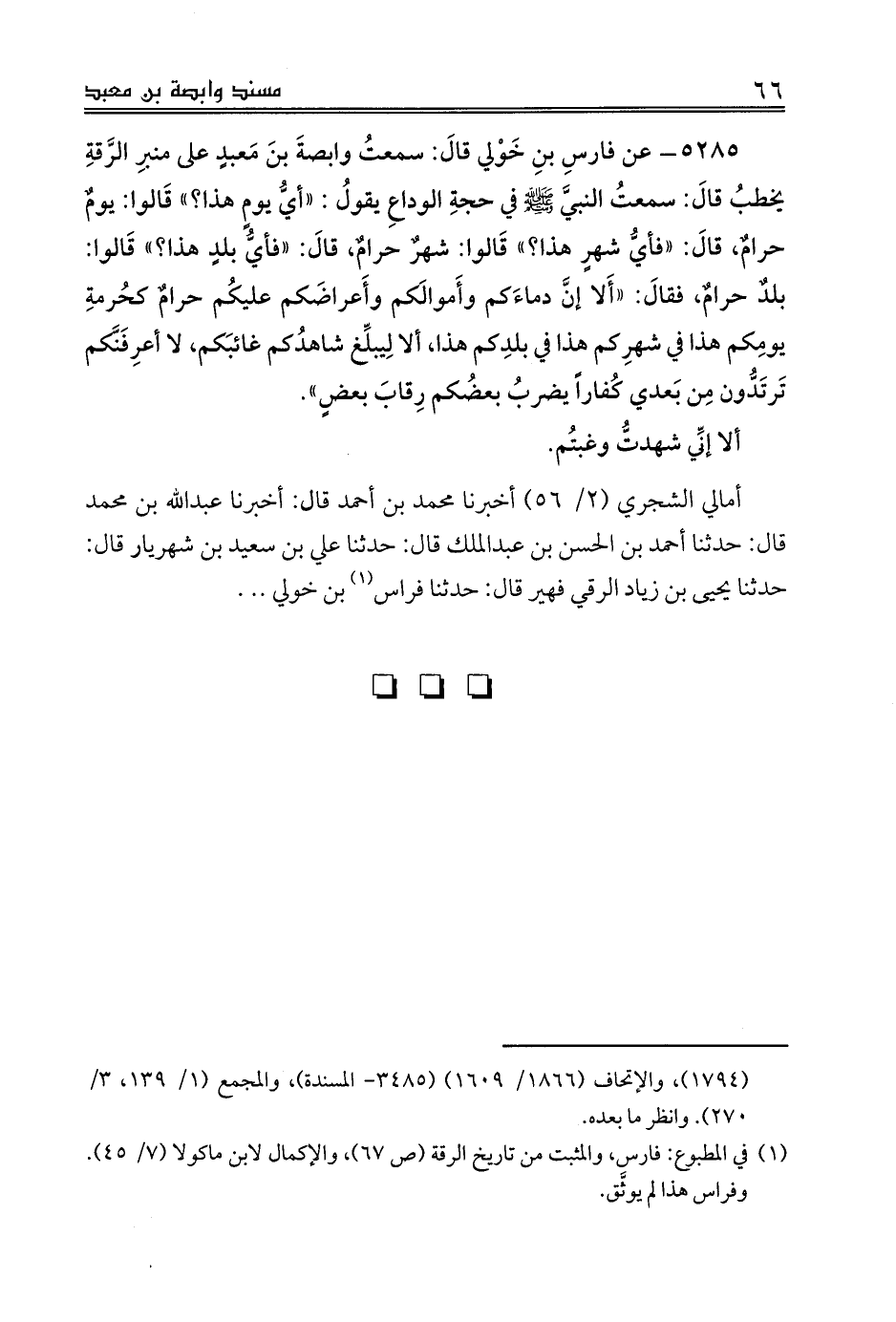 5285 - عن فارسِ بنِ خَوْلي قالَ: سمعتُ واصبةَ بنَ مَعبدٍ على منبرِ الرَّقةِ يخطبُ قالَ: سمعتُ النبيَّ صلى الله عليه وسلم في حجةِ الوداعِ يقولُ: «أيُّ يومٍ هذا؟» قَالوا: يومٌ حرامٌ، قالَ: «فأيُّ شهرٍ هذا؟» قَالوا: شهرٌ حرامٌ، قالَ: «فأيُّ بلدٍ هذا؟» قَالوا: بلدٌ حرامٌ، فقالَ: «أَلا إنَّ دماءَكم وأَموالَكم وأَعراضَكم عليكُم حرامٌ كحُرمةِ يومِكم هذا في شهرِكم هذا في بلدِكم هذا، ألا لِيبلِّغ شاهدُكم غائبَكم، لا أعرِفَنَّكم تَرتَدُّون مِن بَعدي كُفاراً يضربُ بعضُكم رِقابَ بعضٍ».