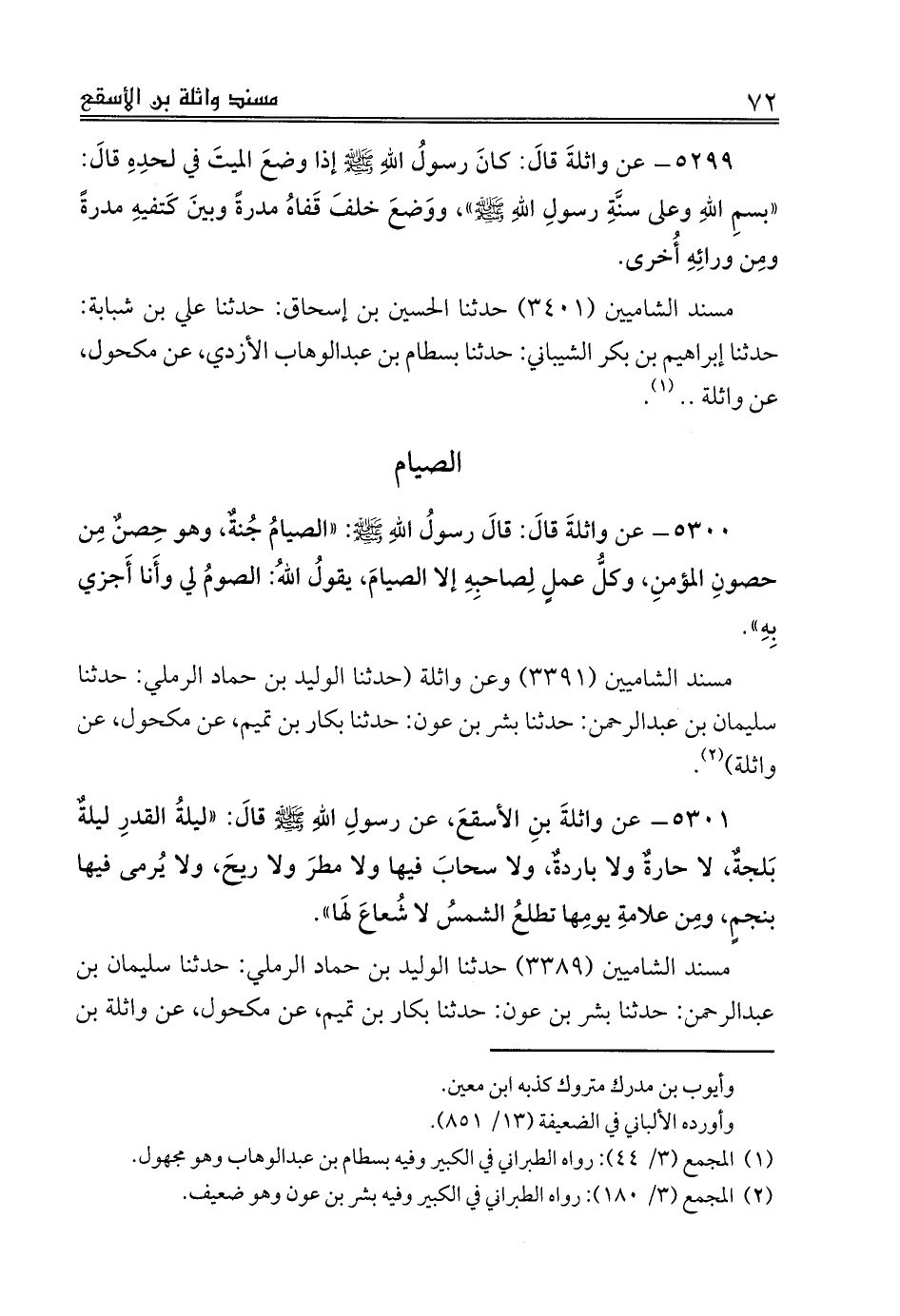 مسند الشاميين (3401) حدثنا الحسين بن إسحاق: حدثنا علي بن شبابة: حدثنا إبراهيم بن بكر الشيباني: حدثنا بسطام بن عبدالوهاب الأزدي، عن مكحول، عن واثلة .. (¬1).
