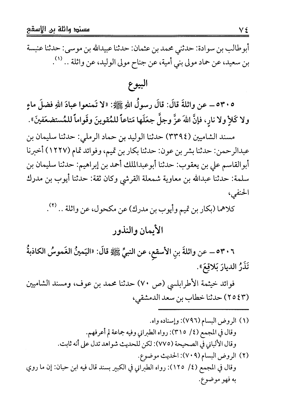 5305 - عن واثلةَ قالَ: قالَ رسولُ اللهِ صلى الله عليه وسلم: «لا تَمنعوا عبادَ اللهِ فضلَ ماءٍ ولا كَلأٍ ولا نارٍ، فإنَّ اللهَ عزَّ وجلَّ جعَلَها مَتاعاً للمُقوينَ وقَواماً للمُستضعَفينَ».
