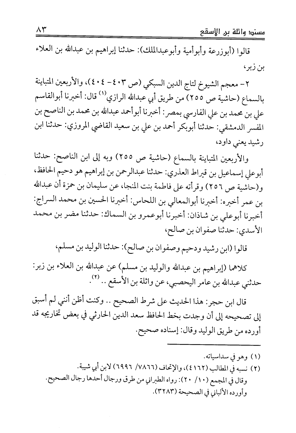 والأربعين المتباينة بالسماع (حاشية ص 255) وبه إلى ابن الناصح: حدثنا أبوعلي إسماعيل بن قيراط العذري: حدثنا عبدالرحمن بن إبراهيم هو دحيم الحافظ، و (حاشية ص 256) وقرأته على فاطمة بنت المنجا، عن سليمان بن حمزة أن عبدالله بن عمر أخبره: أخبرنا أبوالمعالي بن اللحاس: أخبرنا الحسين بن محمد السراج: أخبرنا أبوعلي بن شاذان: أخبرنا أبوعمرو بن السماك: حدثنا مضر بن محمد الأسدي: حدثنا صفوان بن صالح،