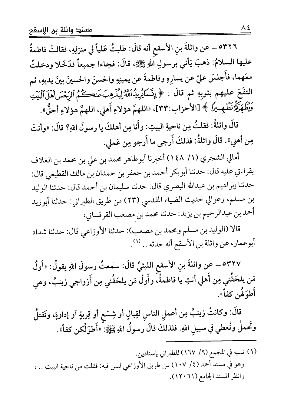 5326 - عن واثلةَ بنِ الأسقعِ أنه قالَ: طلبتُ عَلياً في منزلِهِ، فقالتْ فاطمةُ عليها السلامُ: ذهبَ يَأتي برسولِ اللهِ صلى الله عليه وسلم، قالَ: فجاءآ جميعاً فدَخَلا ودخلتُ معَهما، فأَجلسَ عليّ عن يسارِهِ وفاطمةَ عن يمينِهِ والحسنَ والحسينَ بينَ يديهِ، ثم التفَعَ عليهم بثوبِهِ ثم قالَ: {إِنَّمَا يُرِيدُ اللَّهُ لِيُذْهِبَ عَنْكُمُ الرِّجْسَ أَهْلَ الْبَيْتِ وَيُطَهِّرَكُمْ تَطْهِيرًا} [الأحزاب:33]، «اللهمَّ هؤلاءِ أَهلي، اللهمَّ هؤلاءِ أحقُّ».