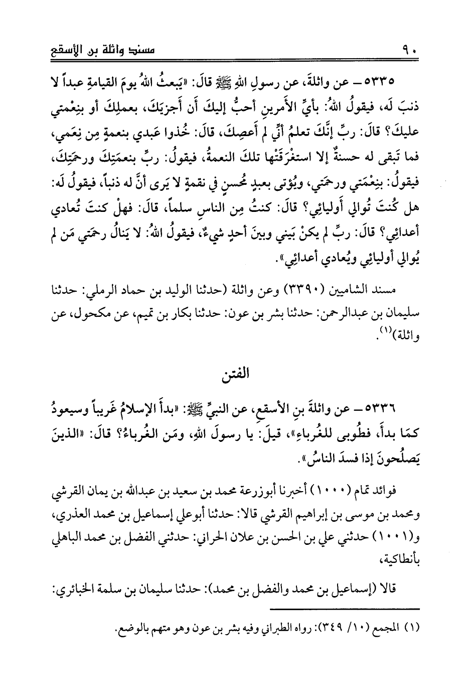 5335 - عن واثلةَ، عن رسولِ اللهِ صلى الله عليه وسلم قالَ: «يَبعثُ اللهُ يومَ القيامةِ عبداً لا ذنبَ لَه، فيقولُ اللهُ: بأيِّ الأَمرينِ أحبُّ إليكَ أَن أَجزيَكَ، بعملِكَ أو بنِعْمتي عليكَ؟ قالَ: ربِّ إنَّكَ تعلمُ أنِّي لم أَعصِكَ، قالَ: خُذوا عَبدي بنعمةٍ مِن نِعَمي، فما تَبقى له حسنةٌ إلا استغْرَقَتْها تلكَ النعمةُ، فيقولُ: ربِّ بنعمَتِكَ ورحمَتِكَ، فيقولُ: بنِعْمَتي ورحمَتي، ويُؤتى بعبدٍ مُحسنٍ في نقمةٍ لا يَرى أنَّ له ذنباً، فيقولُ لَه: هل كُنتَ تُوالي أَوليائِي؟ قالَ: كنتُ مِن الناسِ سلماً، قالَ: فهلْ كنتَ تُعادي أعدائِي؟ قالَ: ربِّ لم يكنْ بَيني وبينَ أحدٍ شيءٌ، فيقولُ اللهُ: لا يَنالُ رحمَتي مَن لم يُوالي أوليائِي ويُعادي أعدائِي».