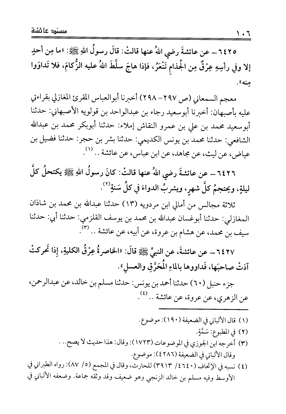 6426 - عن عائشةَ رضي اللهُ عنها قالتْ: كانَ رسولُ اللهِ صلى الله عليه وسلم يكتحلُ كلَّ ليلةٍ، ويحتجمُ كلَّ شهرٍ، ويشربُ الدواءَ في كلِّ سَنةٍ (¬2).