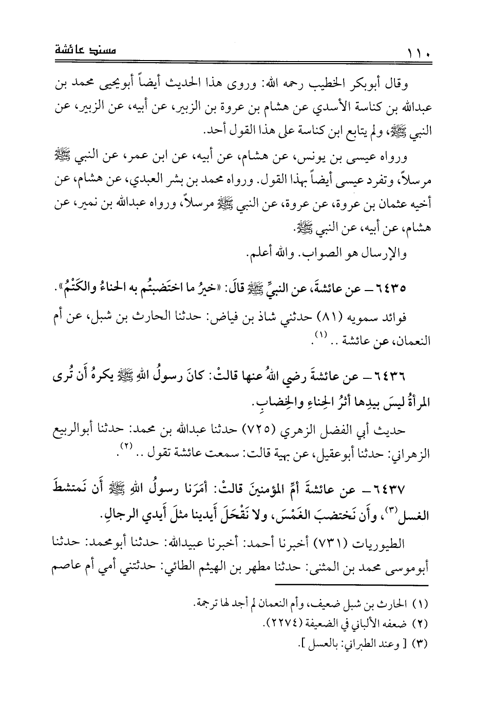 6435 - عن عائشةَ، عن النبيِّ صلى الله عليه وسلم قالَ: «خيرُ ما اختَضبتُم به الحناءُ والكَتْمُ».