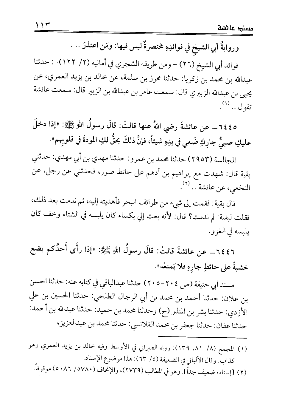 مسند أبي حنيفة (ص 204 - 205) حدثنا عبدالباقي في كتابه عنه: حدثنا الحسن بن علان: حدثنا أحمد بن محمد بن أبي الرجال الطلحي: حدثنا الحسين بن علي الأزدي: حدثنا بشر بن المنذر (ح) وحدثنا محمد بن حميد: حدثنا عبدالله بن أحمد: حدثنا عفان: حدثنا جعفر بن محمد القلانسي: حدثنا محمد بن عبدالعزيز،